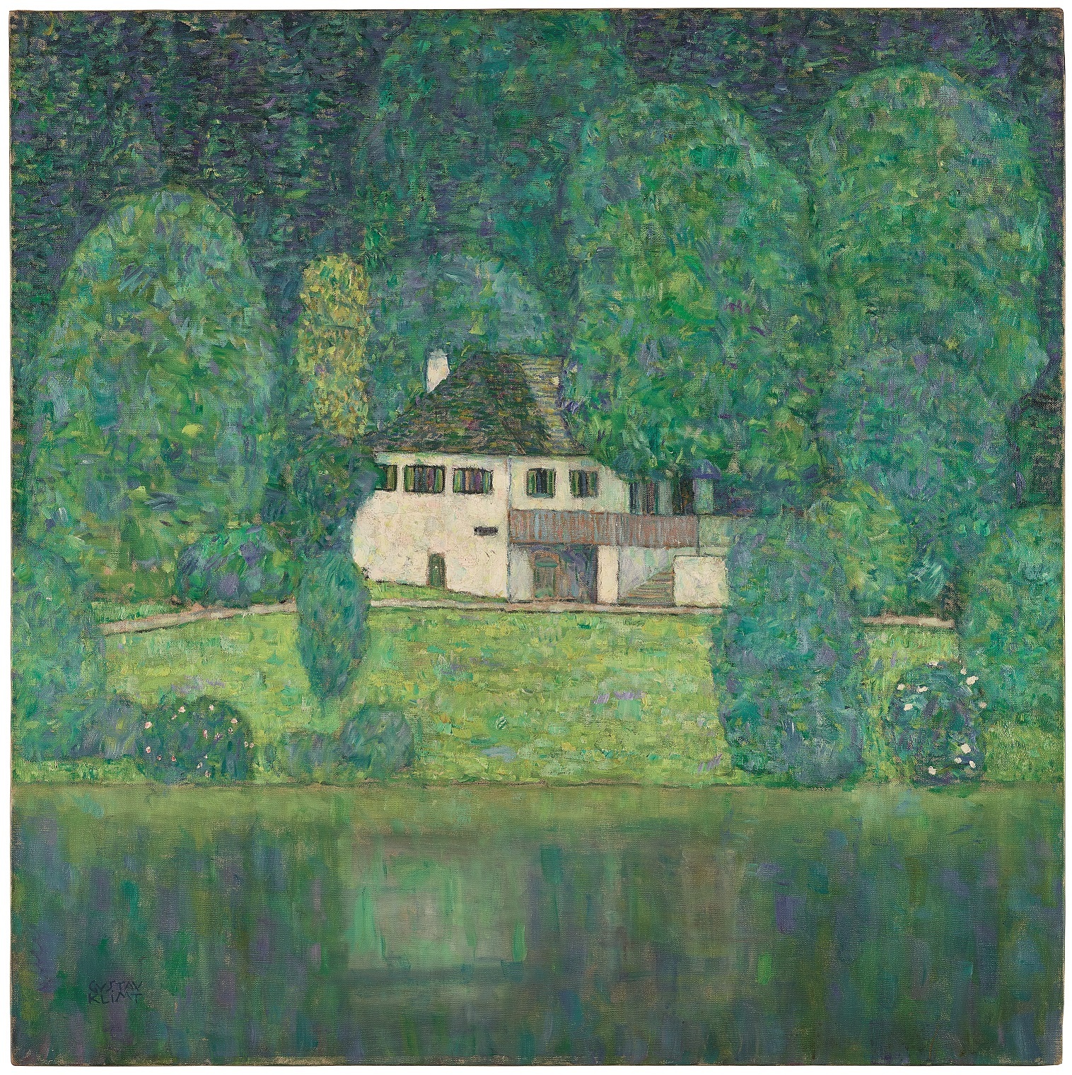 Seit der Eröffnung des Gustav-Klimt-Zentrums in Kammer-Schörfling im Juli 2012 ist nun wieder – bereits in der achten Saison – ein hochkarätiges Meisterwerk des berühmten Jugendstilkünstlers am Attersee zu Gast. Die stimmungsvolle Landschaft war im Erstbesitz der Klimt-Sammler Otto und Eugenia Primavesi und ist seit 2018 eine Dauerleihgabe aus Privatbesitz im Wiener Leopold Museum und bereichert dort die von Direktor Hans-Peter Wipplinger gestaltete Dauerausstellung „Wien 1900. Aufbruch in die Moderne“. Nun, nach über 100 Jahren, kehrt sie für kurze Zeit – bis 14. Juli 2019 – an den genius loci zurück. Das ursprünglich von der Brauerei Litzlberg als Lagerkeller errichtete Gebäude war zu Klimts Zeit eine beliebte Jausenstation und ist heute ein traditionsreiches Restaurant. Im Gemälde ist das Haus zweidimensional in die Bildmitte gesetzt und versinkt, hell-weiß leuchtend und vom See isoliert, im nuancenreichen Grün-Blau der Baumlandschaft. Lediglich die rosa blühenden Heckenrosen am Seeufer durchbrechen die blau-grüne Farbpalette.