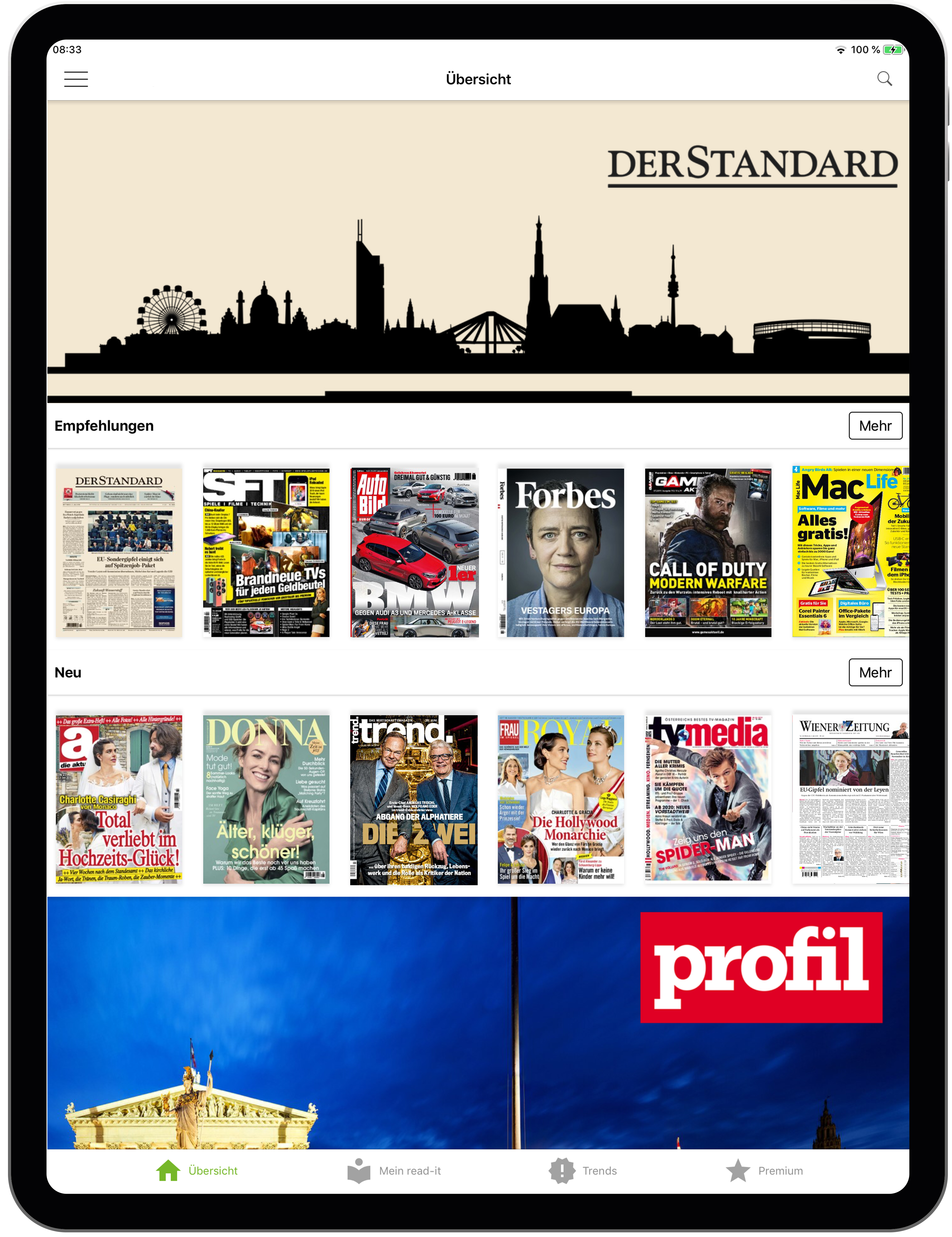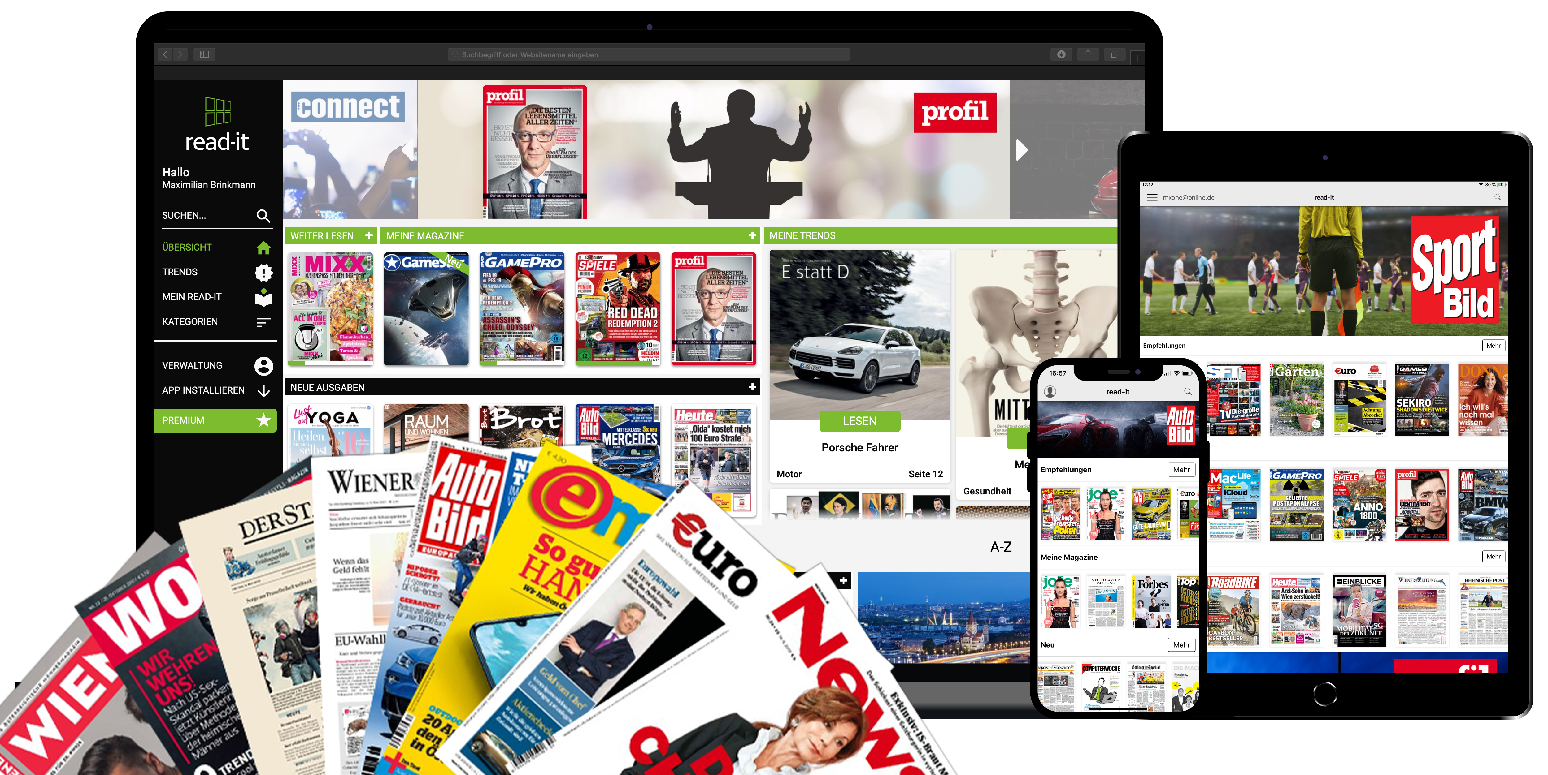 Das umfangreiche Angebot von read-it umfasst inzwischen mehr als 670 Zeitungen und Magazine. Für alle, die die Vorteile der Premiumversion auf begrenzte Zeit, beispielsweise im Urlaub nutzen möchten, gibt es die neuen In-App Angebote. Damit können diverse Laufzeiten gebucht werden. Eine eintägige Nutzung gibt es für 1,99 Euro und sieben Tage für 5,99 Euro. Auch die Anzahl der verfügbaren Titel wird kontinuierlich erweitert und wurde seit dem Start 2016 mehr als verdreifacht. Unter den jüngsten Neuzugängen befinden sich mit „DER STANDARD“ und viele prominente Medientitel aus Österreich und Deutschland wie „Forbes“, „Sport Bild“, „Computer Bild“ und „profil“. Nach dem Launch in 2016 hat sich das Modell mittlerweile auch erfolgreich in Deutschland und der Schweiz etabliert. Eine Vielzahl großer Medienhäuser nutzt die App als zusätzliches Distributionstool.