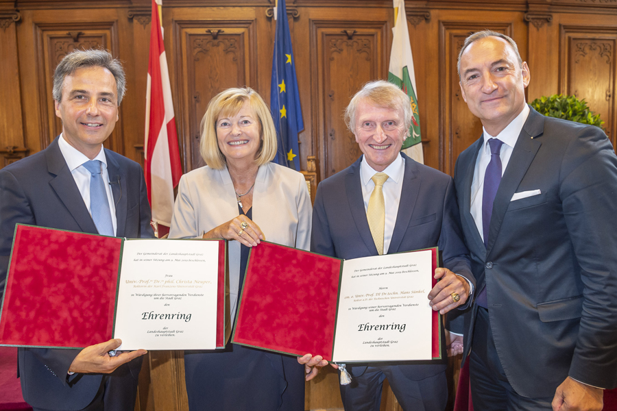Dass Graz eine Stadt der Wissenschaft und Forschung ist, diese Tatsache wurde heute einmal mehr bestätigt. Zwei Persönlichkeiten aus diesem Bereich erhielten eine ganz besondere Honoration: den Ehrenring. Univ.-Prof.in Dr.in phil. Christa Neuper, Rektorin der Karl-Franzens-Universität Graz und der ehemalige Rektor der Technischen Universität Graz, Univ.-Prof. DI Dr. techn. Hans Sünkel.