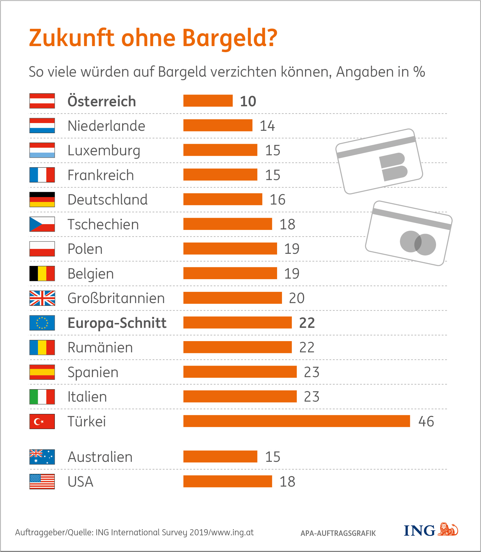 Nur jeder zehnte Österreicher könnte einer bargeldlosen Zukunft etwas abgewinnen. Das zeigt eine internationale Studie der ING in Österreich (www.ing.at). Für die Studie wurden 13 Länder in Europa, die USA und Australien untersucht. Dabei zeigt sich: Österreich ist die Cash-Nation Nummer eins. Ein Leben ohne Bargeld wird nirgendwo sonst so deutlich abgelehnt.