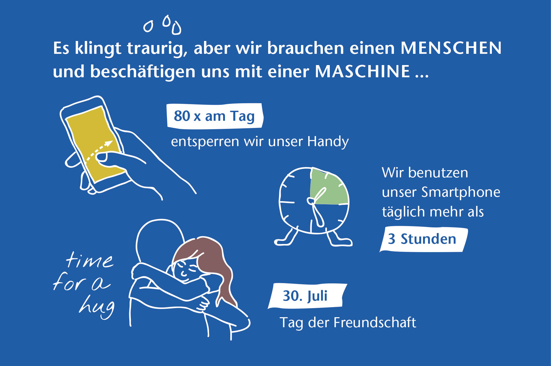 Die Marktforschungsfirma MindTake hat in einer repräsentativen Umfrage 2018 erhoben, dass Herr und Frau Österreicher ihr Smartphone täglich schon mehr als drei Stunden benutzen. Das ist natürlich nur zu schaffen, wenn man jede freie Minute zum mobilen Device greift und es entsperrt. Studien in Deutschland haben ergeben, dass wir rund 80 Mal am Tag unser Handy entsperren. Wie viel Zeit widmen wir hingegen unseren analogen Freunden? Denen aus Fleisch und Blut?