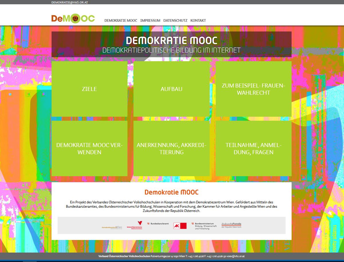 Demokratie MOOC. Ein Projekt des Verbandes Österreichischer Volkshochschulen in Kooperation mit dem Demokratiezentrum Wien. Kostenfrei auf der iMOOX Plattform der TU Graz. Gefördert aus Mitteln des Bundeskanzleramtes, des Bundesministeriums für Bildung, Wissenschaft und Forschung, der Kammer für Arbeiter und Angestellte Wien und des Zukunftsfonds der Republik Österreich. https://demooc.at/