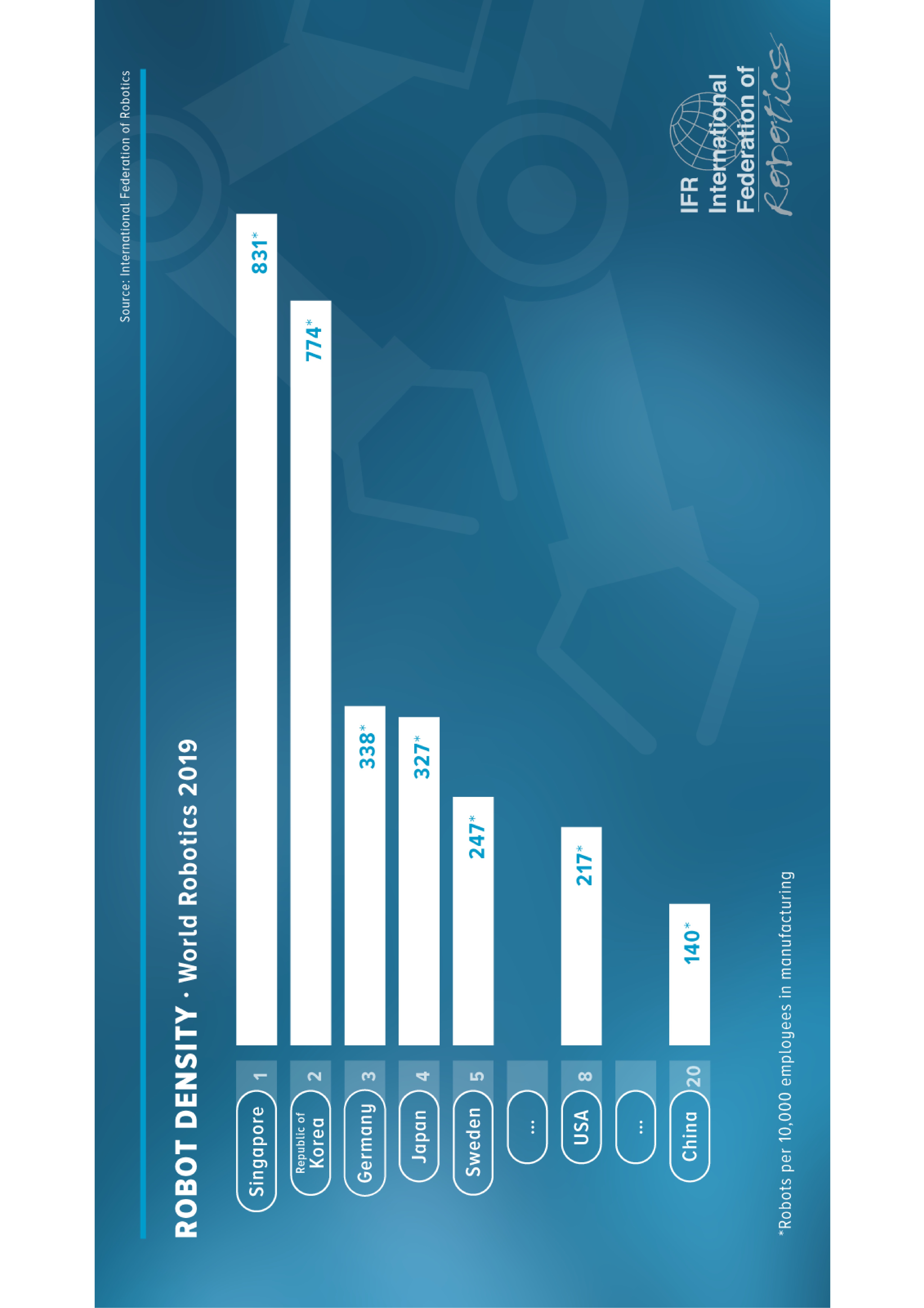 Die Automobilindustrie ist nach wie vor der weltweit größte Anwender von Robotern mit einem Anteil von fast 30 % am Gesamtangebot (2018). Nach einem sehr starken Jahr 2017 mit einem Anstieg der Installationen um 21 % wurde dieses Niveau gehalten und 2018 leicht um 2 % erhöht. Investitionen in neue Automobilproduktionskapazitäten und in die Modernisierung haben die Roboter-Nachfrage beflügelt. Der Einsatz neuer Materialien, die Entwicklung energieeffizienter Antriebssysteme und der starke Wettbewerb auf allen wichtigen Automobilmärkten führten zu Investitionen. 79 % der Installationen von Industrierobotern fanden dabei in 5 Schlüsselmärkten statt: China (39.351 Einheiten), Japan (17.346 Einheiten), Deutschland (15.673 Einheiten), die Vereinigten Staaten (15.246 Einheiten) und die Republik Korea (11.034 Einheiten). Interessant: Indien, nach der OICA-Produktionsstatistik viertgrößtes Fahrzeugherstellerland der Welt, hat nur knapp 2.100 Industrieroboter in seiner Automobilindustrie installiert.