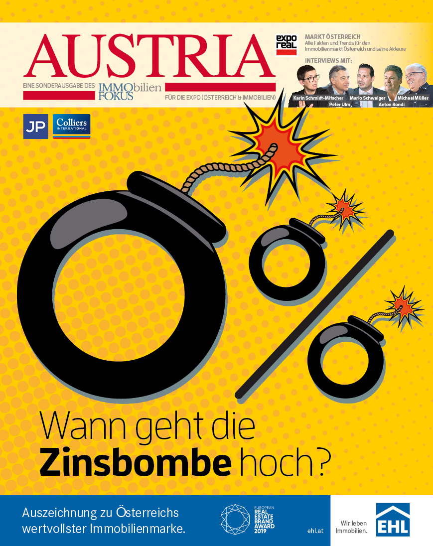 Wie ist es derzeit um den Wirtschaftsstandort Österreich bestellt? Wann platzt die Zinsbombe? Lohnt sich das Investment in Wohnimmobilien angesichts der schwelenden Debatte um eine gesetzliche Mietpreisbremse oder mieterfreundlicher Gesetze überhaupt noch? Und wie sieht die Klimakrise weltweit aus? Das und vieles mehr wird in der ImmoFokus-Sonderausgabe „Austria“ zur diesjährigen Expo Real 2019, die von 7. bis 9. Oktober in München stattfindet, thematisiert.