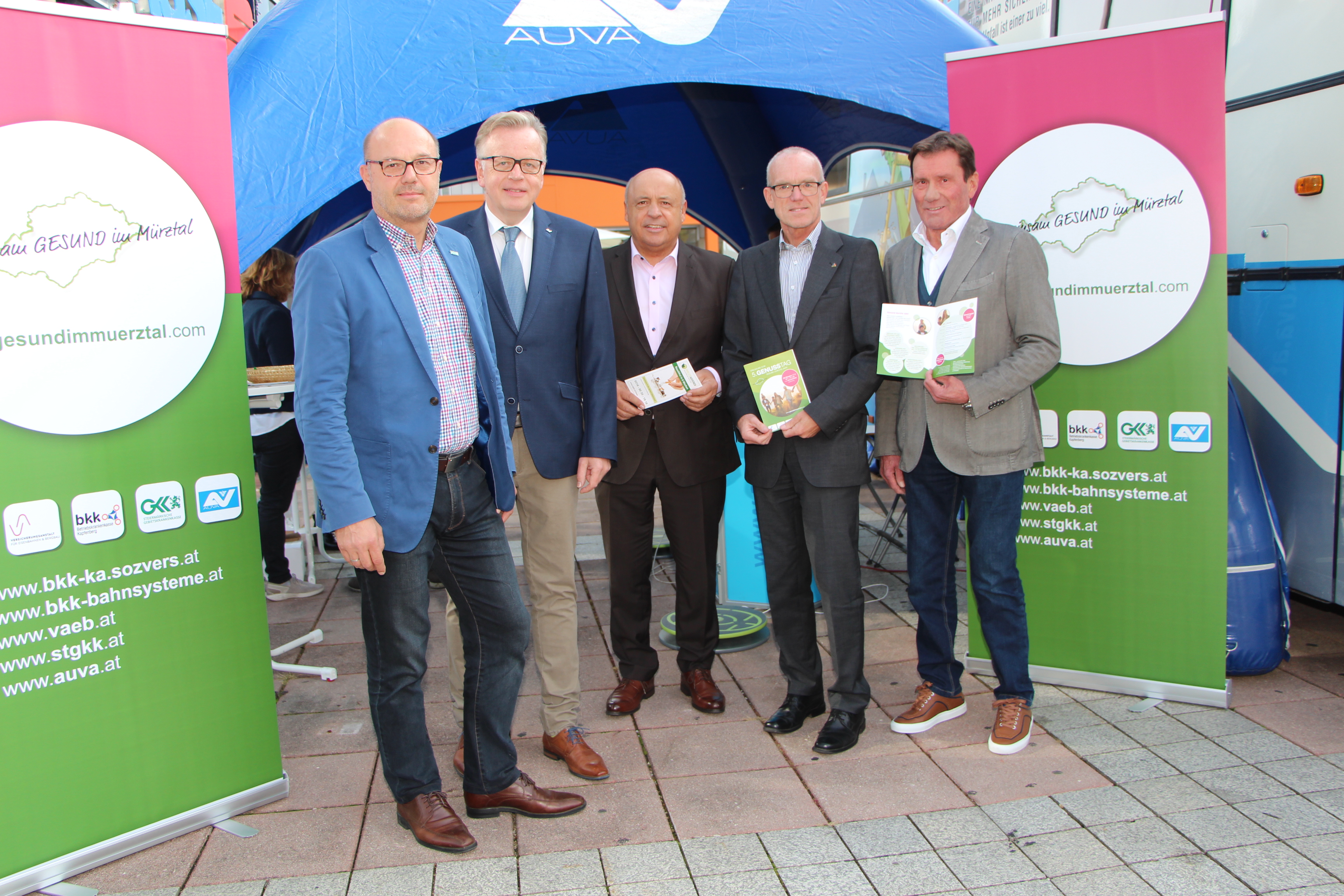 Die Obmänner der beteiligten Sozialversicherungsträger, Gottfried Winkler (VAEB), Josef Harb (STGKK), Peter Bacun (BKK Kapfenberg), Josef Gritz (BKK voestalpine Bahnsysteme) und Direktor Hannes Weissenbacher von der AUVA-Landesstelle Graz begleiten den Infobus zur ersten Station vor dem Einkaufscenter ECE Kapfenberg ab 13:00 Uhr.