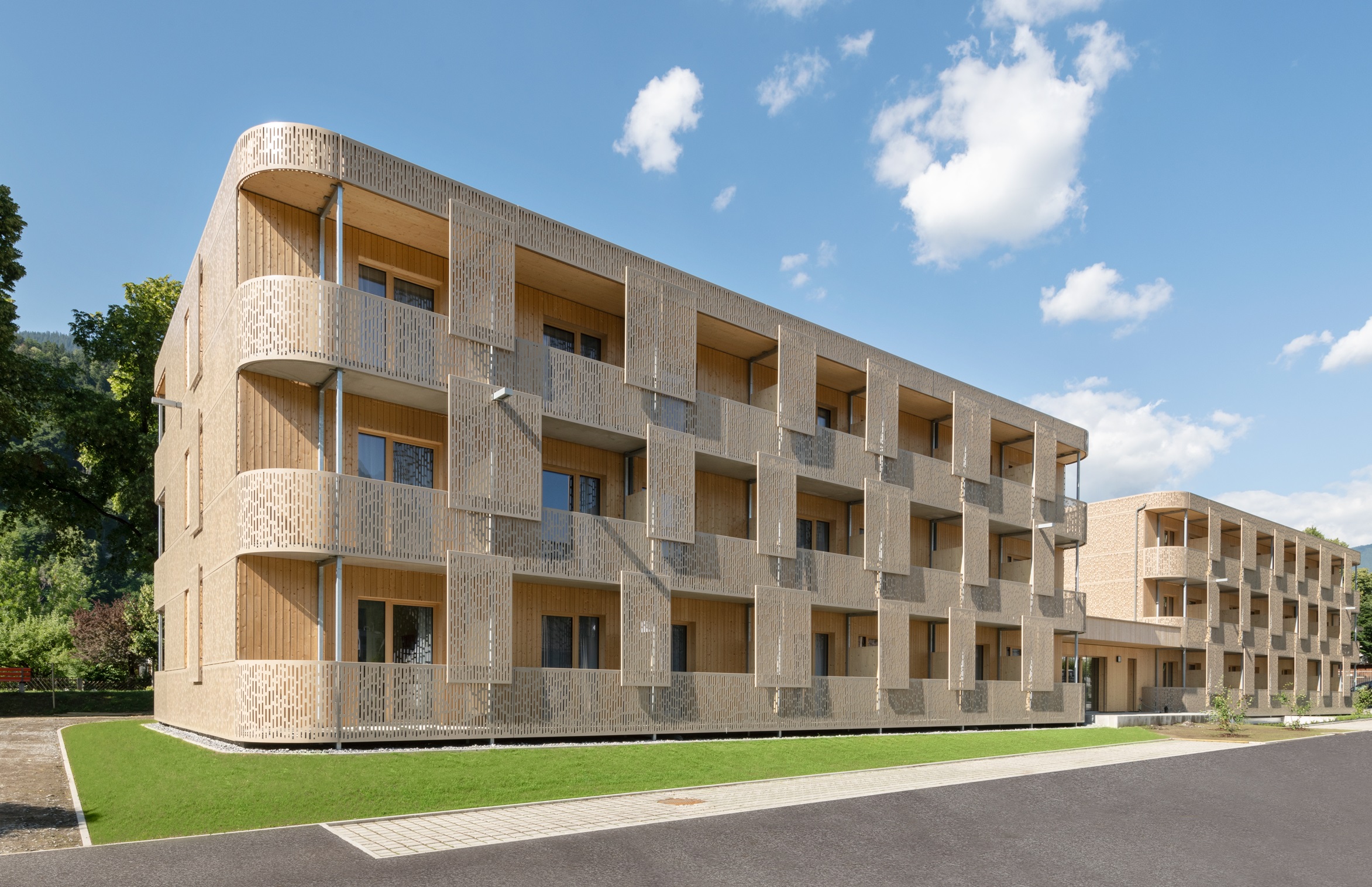 Die beiden dreistöckigen Gebäude mit 52 Wohneinheiten wurden in Holzmodulbauweise errichtet - Die komfortablen, kostenfreien Unterkünfte zeichnen sich durch hohe Ausführungsqualität aus