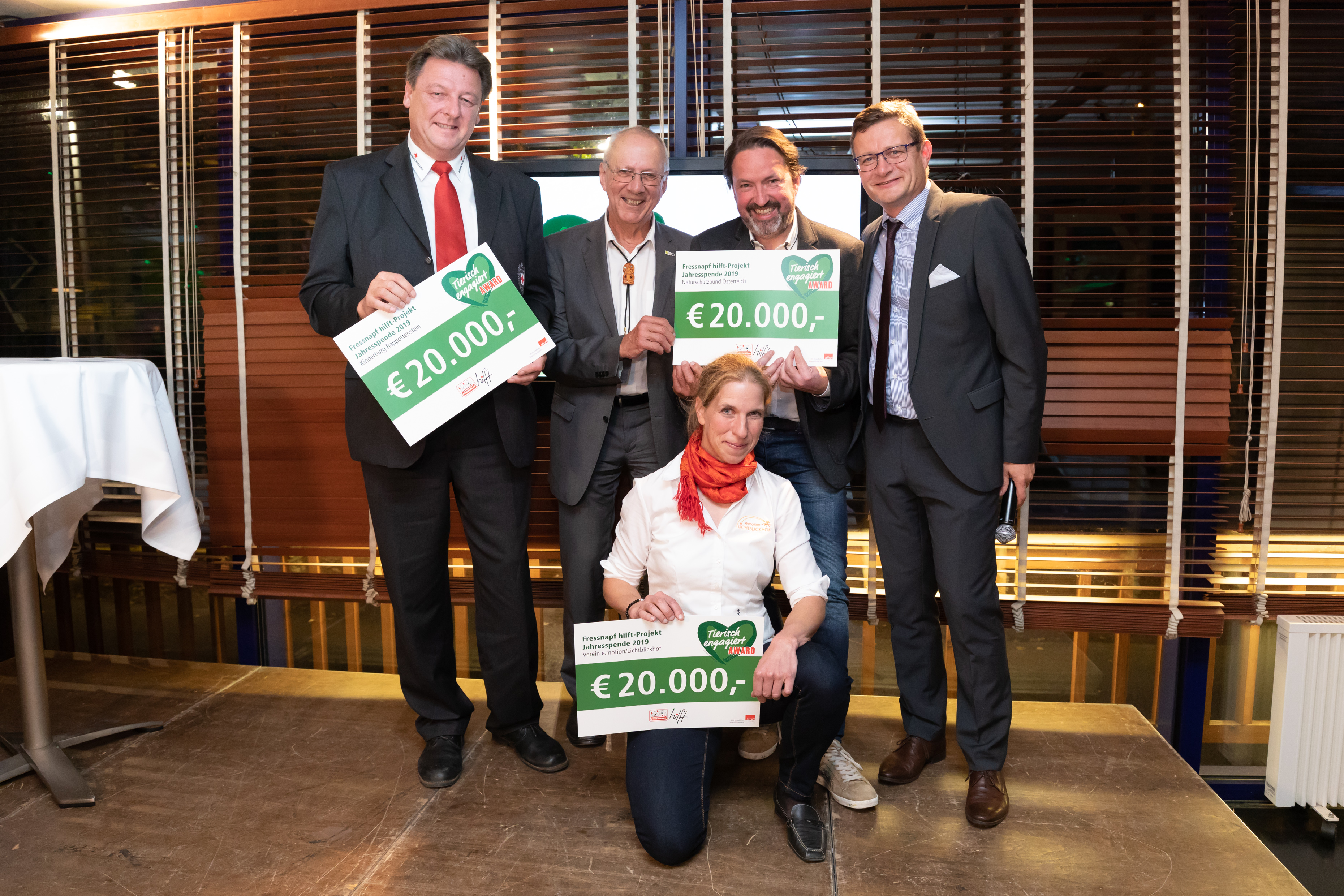 Im Zuge des Gala-Abends in der Summerstage wurden nicht nur Österreichs tierische Helden 2019 geehrt. Die Initiative „Fressnapf hilft!“ spendete 80.000 Euro an ausgewählte Projekte: Die Kinderburg Rappottenstein, der Naturschutzbund mit dem Projekt „Vögel im Siedlungsraum erkennen und schützen“ und das Therapiezentrum Lichtblickhof des Vereins e.motion erhielten Schecks im Wert von jeweils 20.000 Euro, ebenso wie der Verein „Freunde der Tierecke“ von Tierschützerin Maggie Entenfellner. „Wir unterstützen mit diesen Spenden besondere Vereine, die sich jeden Tag mit Leidenschaft für Mensch und Tier einsetzen. Dieses Engagement wollen wir fördern“, betont Hermann Aigner.