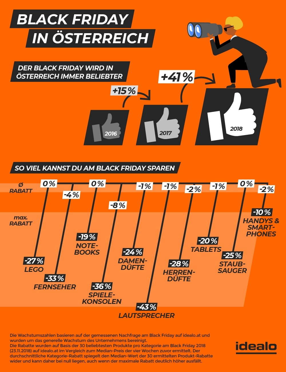 [1: Analysiert wurden die Preise der Top-30-Produkte in den Top-30-Kategorien auf idealo.at am Black Friday 2018 (23. November 2018). Als Vergleichswert wurde der Medianpreis der gleichen Produkte in den vier Wochen vor dem Black Friday hinzugezogen (26.10. bis 22.11.21018).]