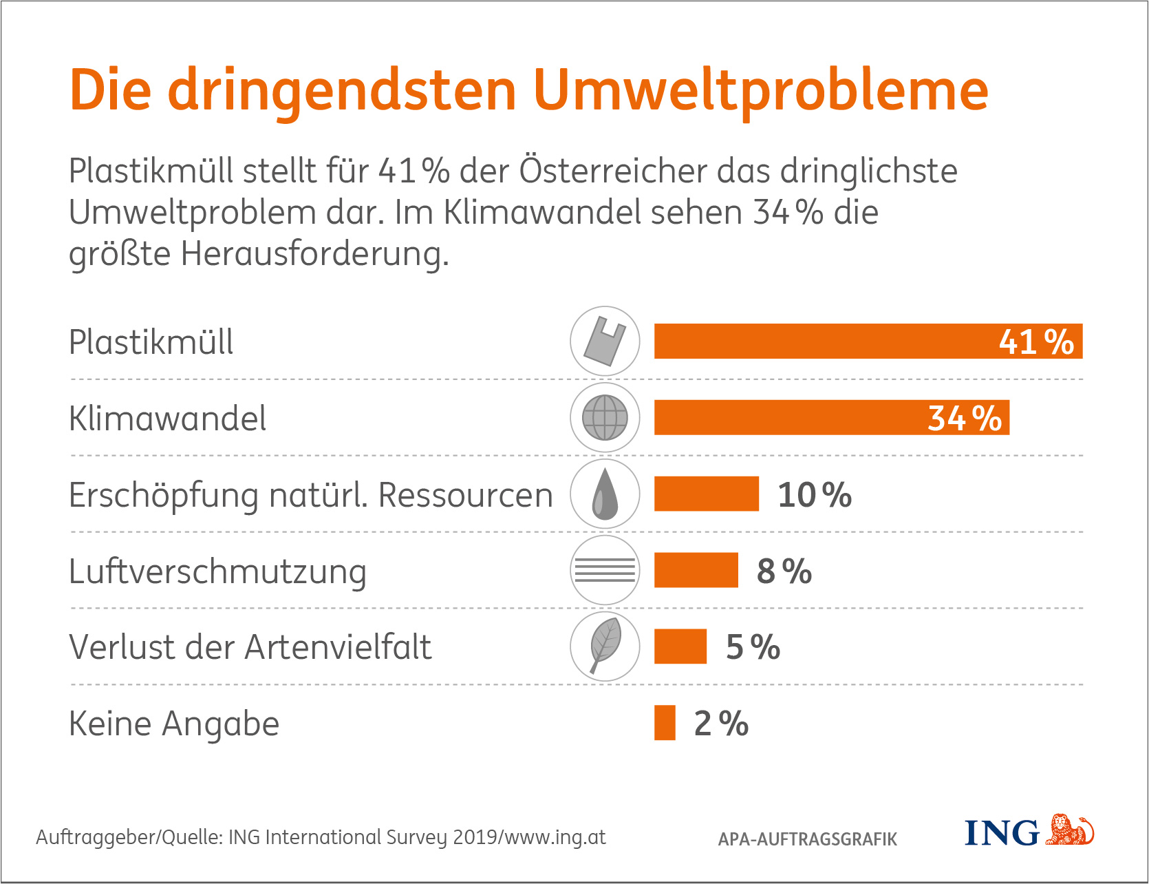 Wird der Blick auf die Umwelt gelenkt, so bereiten Plastikverschmutzung und Klimawandel den Österreichern die größten Sorgen – dieses Ergebnis liefert die neueste ING International Survey der ING in Österreich (www.ing.at).