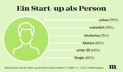 Ein junger Mann (72%), zwischen 20 und 29 Jahre alt (58%), Single (61%) und kinderlos (71%). Er besitzt die Matura (65%) und lebt in der Stadt (79%). Jugendlich, unabhängig und ungebunden, gebildet. So präsentiert er sich. Dürfen wir vorstellen? Das ist „Herr Start-up“ aus Sicht der Österreicher – zumindest wenn dieses Unternehmen eine Person wäre.