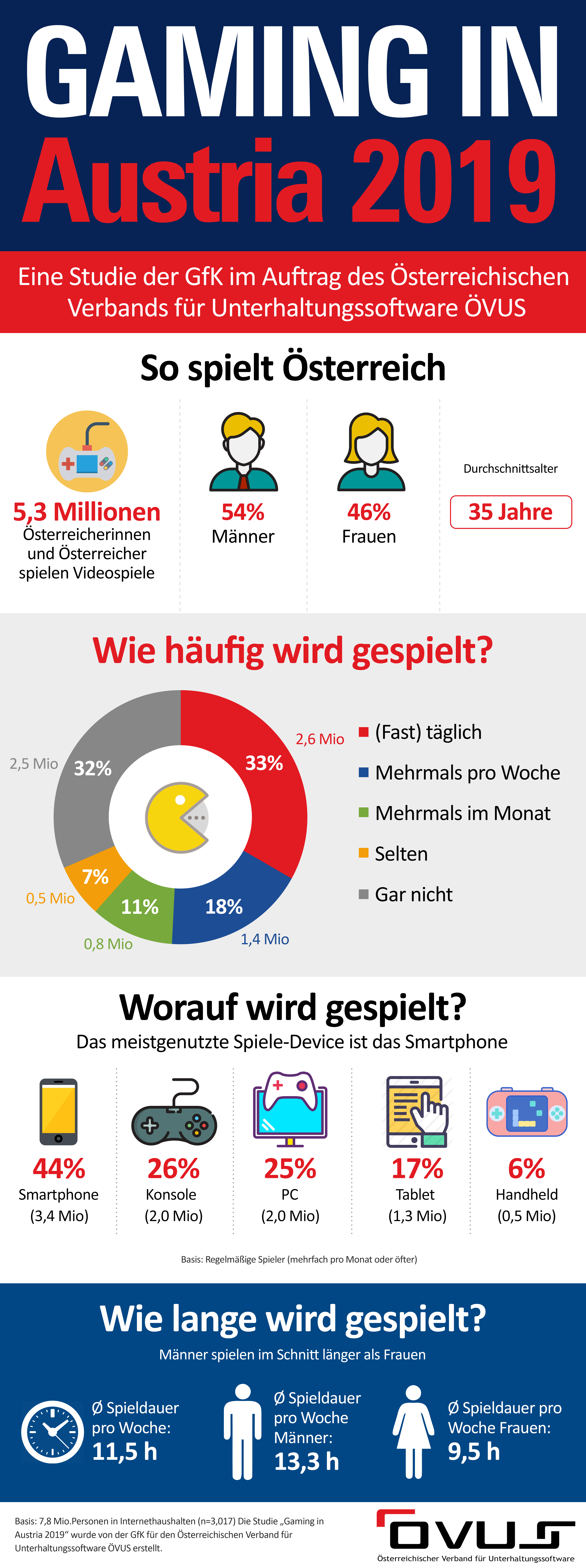 Sechs von zehn Österreicherinnen und Österreichern (in Online-Haushalten) spielen mehrmals pro Monat oder öfter (62 Prozent), ein Drittel (33 Prozent) spielt täglich. Die durchschnittliche wöchentliche Spieldauer ist von zuletzt 10,3 Stunden im Jahr 2017 auf 11,5 Stunden im Jahr 2019 gestiegen.