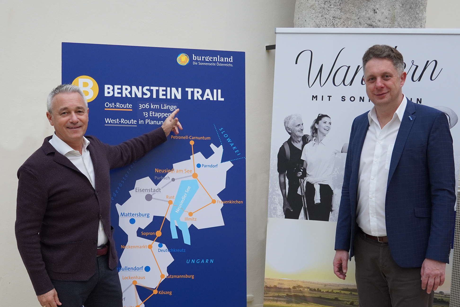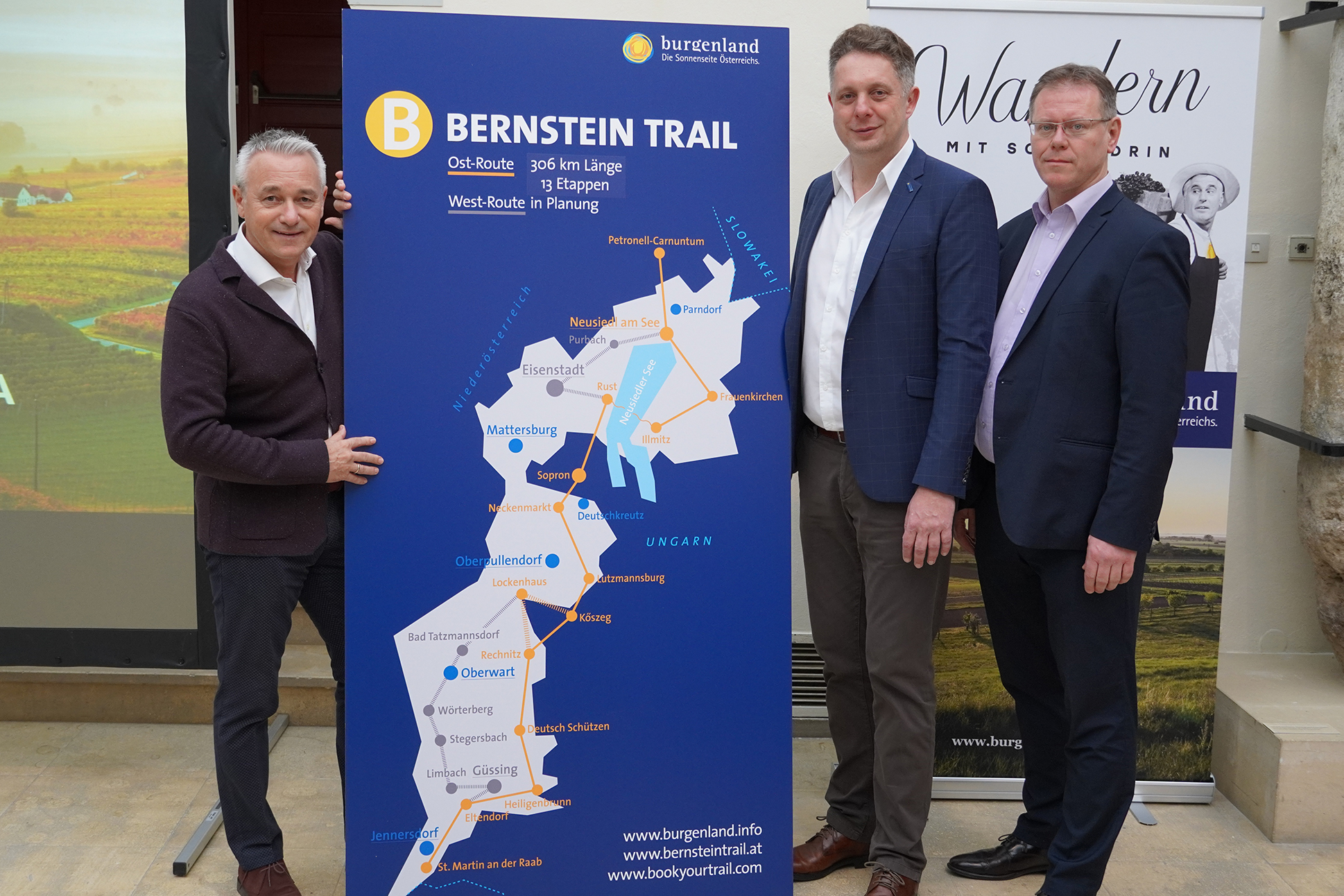 Zu Jahresbeginn startete Burgenland Tourismus gemeinsam mit den Tourismusverbänden das Projekt „Bernstein Trail“. Heute Vormittag wurde in Eisenstadt die Ost-Route des ersten buchbaren burgenländischen Weitwanderweges mit einer Länge von 306 km und 13 Etappen, teilweise entlang der alten römischen Bernsteinstraße, eröffnet.