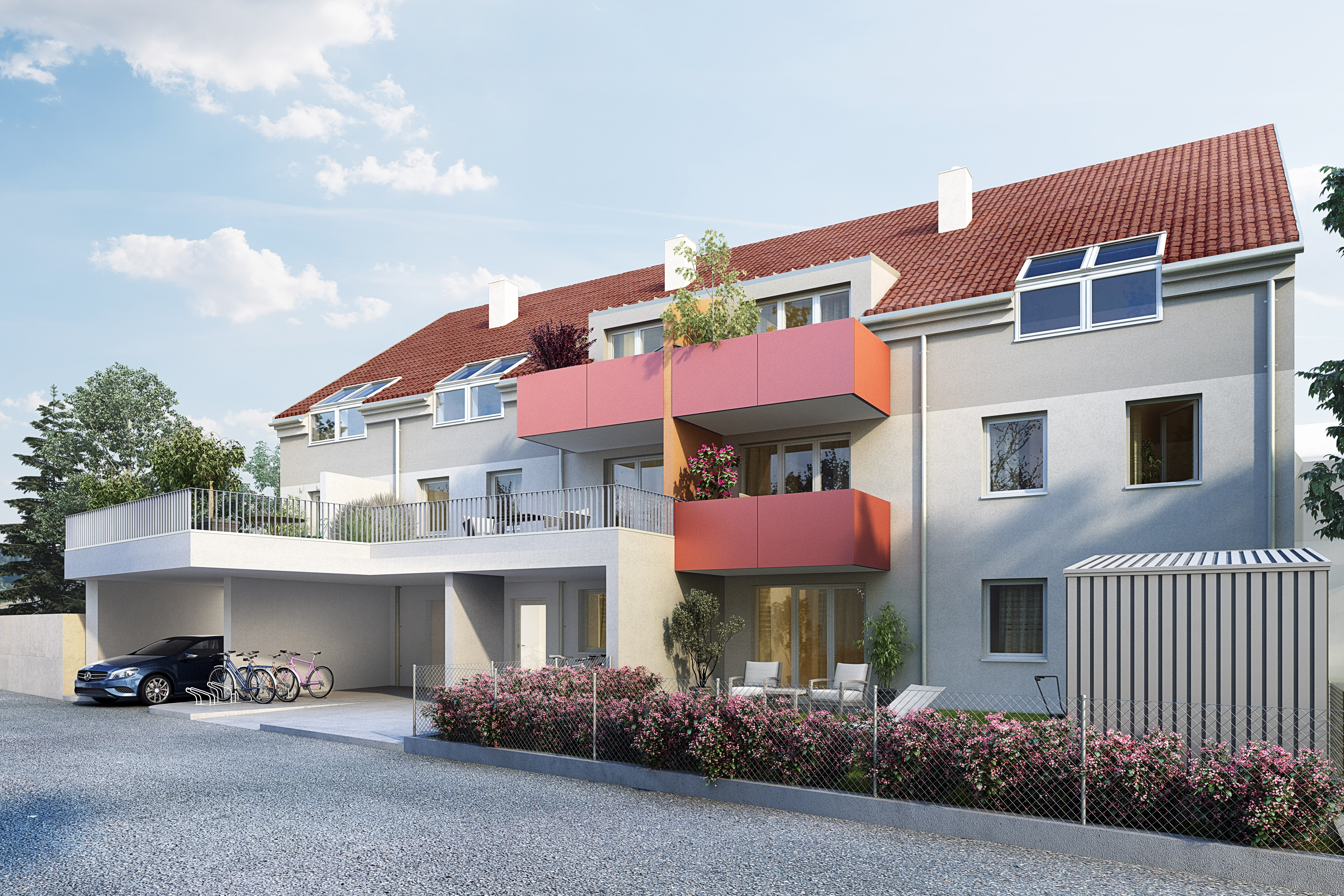 - Autoabstellplätze in der Tiefgarage (zwei pro Wohnung)