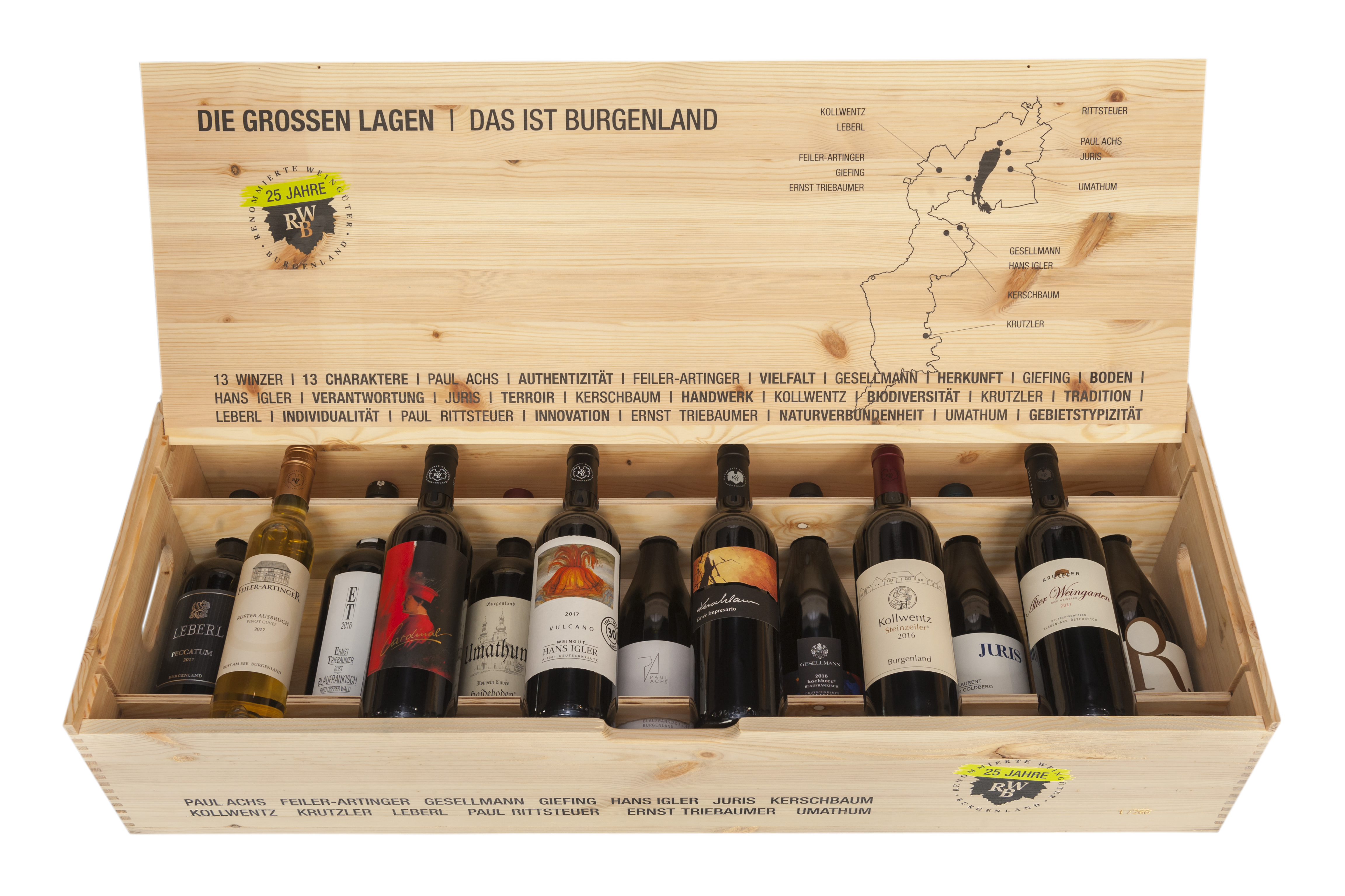 Geheim-Tipp (bitte nicht weitersagen): Alle Weinbauregionen des Burgenlandes in einer Holzkiste. 13 Winzer | 13 Weine | die großen Lagen | das ist Burgenland !!! Sonderedition: Einmalige, limitierte Auflage anlässlich 25 Jahre RWB – 260 Stück – nummeriert – so lange der Vorrat reicht. Erhältlich in aller RWB-Weingütern und auf rwb.at.