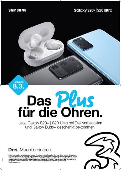 - Bei S20+/ S20 Ultra Vorbestellung bis 8. März Galaxy Buds+ geschenkt.
