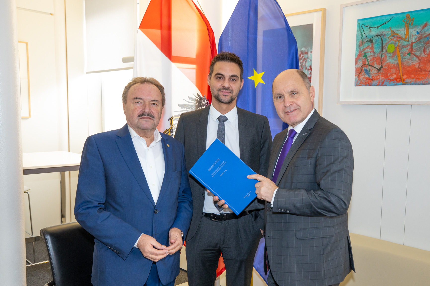 Mit großem Interesse folgte Nationalratspräsident Mag. Wolfgang Sobotka und der Präsident des österreichischen Zivilschutzverbandes Johann Rädler den Ausführungen von Stefan Herzog, anlässlich seiner erfolgreich abgelegten Promotion im Bereich Informationstechnologien am Institut für Nationale Sicherheit an der Universität in Sofia zum Thema „Auswirkungen von Cyberattacken auf die Nationale Sicherheit“. Die vorgelegte Dissertation behandelt Forschungsthemen, wie etwa die Frage nach einer Neuausrichtung von Nachrichtendiensten, die Risikowahrnehmung durch die Bevölkerung/Wirtschaft/Politik, den Stellenwert der heimischen Rüstungsindustrie oder ein Soll-Ist-Vergleich zwischen der österreichischen und der israelischen Sicherheitsstrategie.