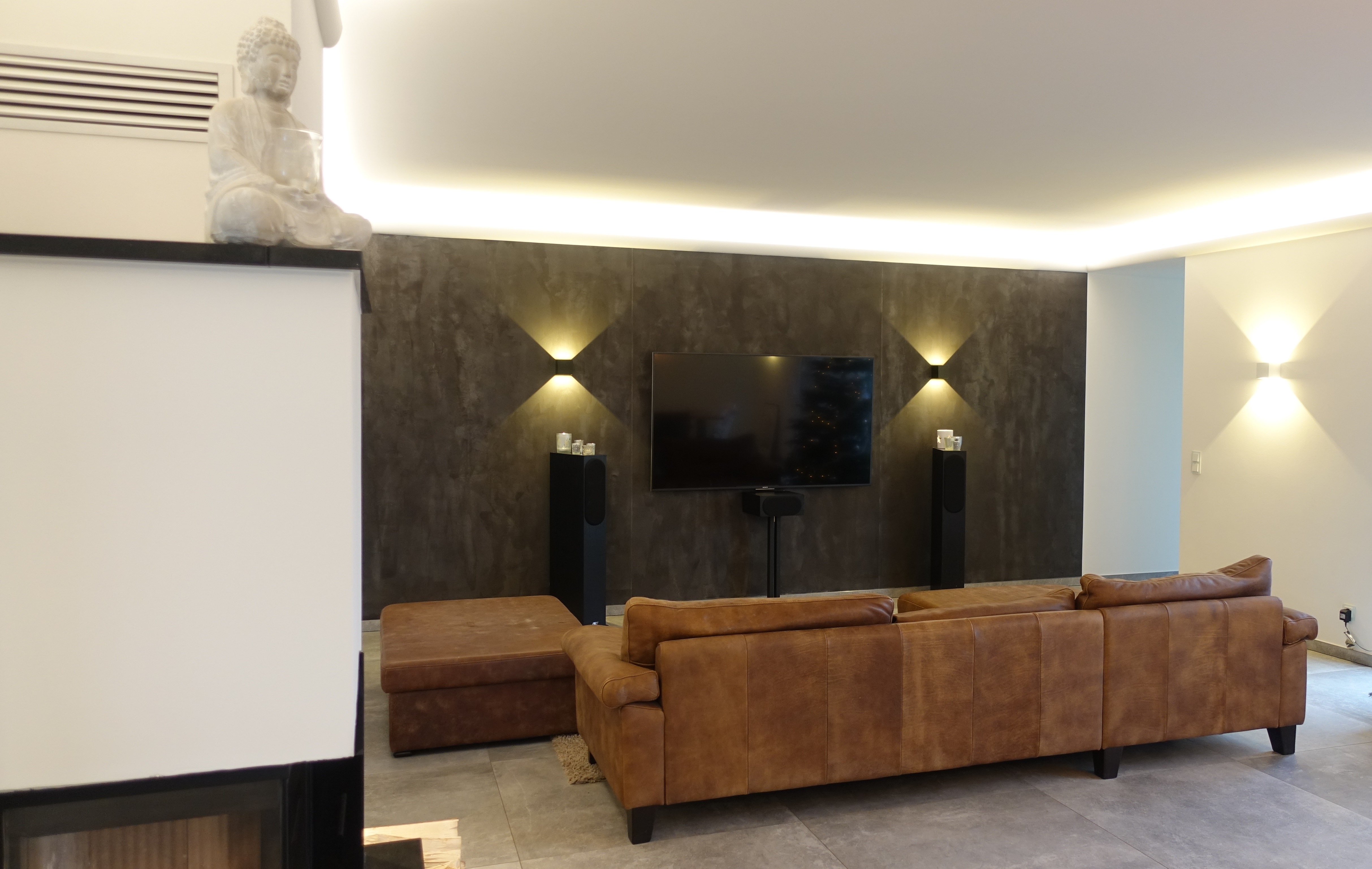 Im Wohnzimmer des Musikers sorgen eine große Glasfront am Tag und ein Kaminofen an kühlen Abenden für Atmosphäre. Die großflächige Stirnseite des Wohnzimmers, an der unter anderem ein Fernseher seinen Platz finden sollte, bot sich als Blickfang für das erste gestalterische Highlight an. Sofort begeisterte sich der Schlagzeuger für eine Schwarzstahloptik, die die Anmutung von unbehandeltem, gewalztem Stahl in den Raum bringt: Die anthrazitfarben changierende Technik wirkt kraftvoll, ohne zu irritieren, und ausgesprochen puristisch, ohne unterkühlt zu sein. Für einen besonderen Effekt hatte sich Gustav Schäfer im gesamten Deckenbereich des Wohnzimmers entschieden: Mit dem TuneLight-System und den Zierprofilen TL erhielt der gesamte Raum eine weitere Gliederung. Die charmante indirekte Beleuchtung aus den umlaufenden Profilen hebt außerdem die in diesem Bereich auch baulich erhöhte Decke optisch weiter an und lässt den Raum noch großzügiger wirken. "TuneLight zählt für mich zu den Gestaltungselementen in unserem Haus, die mir am besten gefallen", ist Gustav Schäfer begeistert von der Behaglichkeit in seinem Wohn- und Essbereich, die durch die indirekte Beleuchtung erzeugt wird. "Auch die Kreativtechniken Rostoptik, Schwarzstahl und die Metallstrukturtechnik Concento sorgen in den Räumen für echte Hingucker. Es ist insgesamt einfach schön geworden - mit ein paar besonderen Highlights."