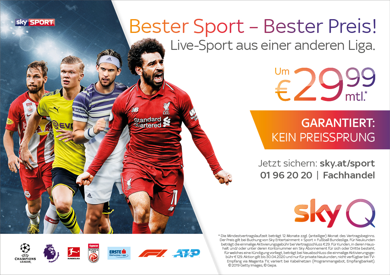 Mit Sky verpasst der Sport-Fan in Österreich auch zukünftig keine Entscheidung: Und ab sofort gibt es den besten Sport in Kombination mit einem unschlagbaren Angebot. Denn Sky garantiert – jetzt neu – keinen Preissprung nach der Mindestvertragslaufzeit. Das Sky Sport + Sky Fußball Bundesliga Paket gibt es ab sofort in Kombination mit dem Sky Entertainment Paket – mit den neuesten und besten Serien – um nur € 29,90/Monat.