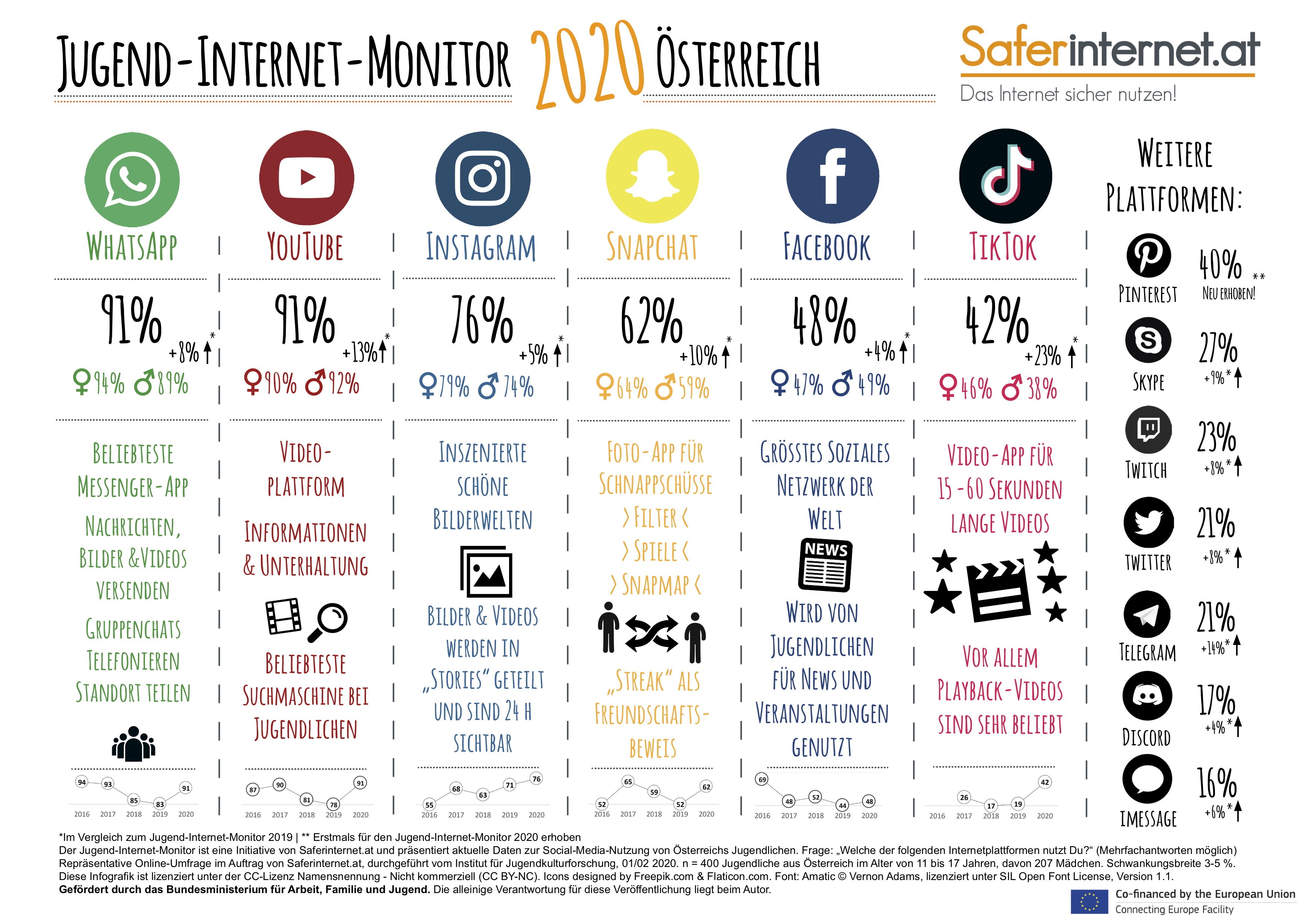 Der Jugend-Internet-Monitor ist eine jährlich durchgeführte und repräsentative Studie im Auftrag von Saferinternet.at, welche zum Ziel hat, herauszufinden, welche Sozialen Netzwerke bei Jugendlichen (11-17 Jahre) in Österreich beliebt und wie relevant diese sind. Alle Informationen zur Studie finden sich unter www.jugendinternetmonitor.at.