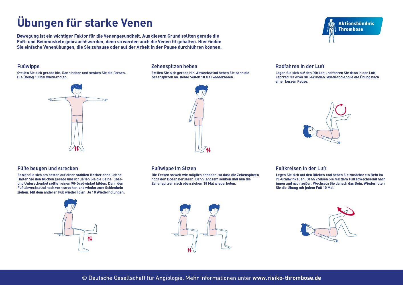 Das Aktionsbündnis Thrombose ist ein Zusammenschluss von medizinischen Fachgesellschaften und einer Patientenvereinigung. Es initiiert eine Aufklärungskampagne, um auf die Risiken von Venenthrombose und Lungenembolie hinzuweisen. Sie soll das öffentliche Bewusstsein für Prävention, Diagnose und Therapie schärfen, damit weniger Menschen an den Folgen einer Thrombose sterben. Weitere Informationen, eine Grafik zur Venengymnastik und Materialien zum kostenlosen Download finden Sie unter www.risiko-thrombose.de