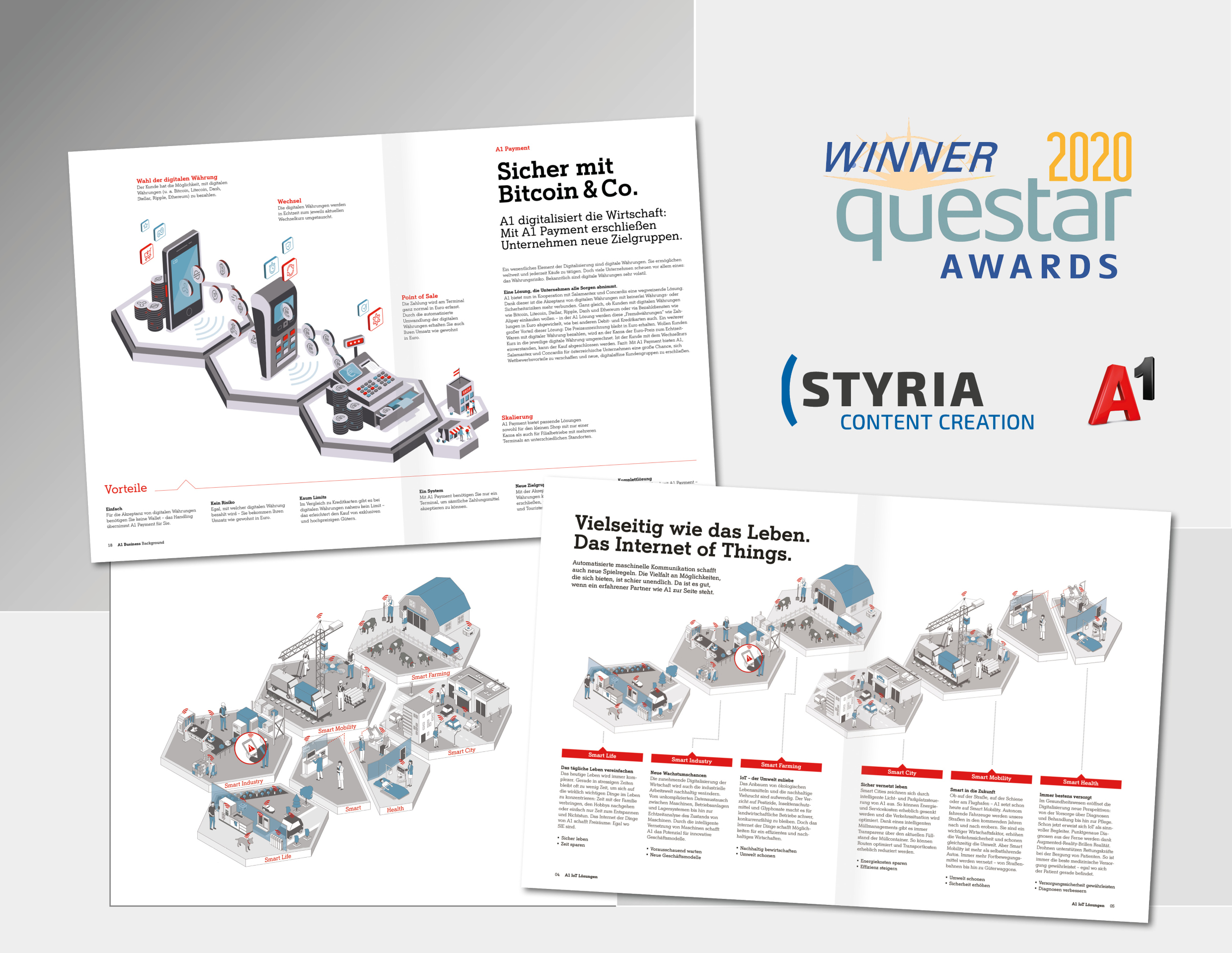 Styria Content Creation (SCC), Magazinverlag & Content Marketing Agentur, feiert ihren bisher besten Start eines Award-Jahres mit allein 11 Auszeichnungen von Jänner bis Mai 2020. Zu den jüngsten gehören nun GOLD und BRONZE bei den internationalen QUESTAR AWARDS, die jährlich die weltweit besten Kampagnen und Projekte in visueller Kommunikation prämieren. Zwei dreidimensionale Infografiken der Styria Content Creation für das Business Magazin der A1 Telekom Austria erhielten nun die begehrten internationalen Awards.