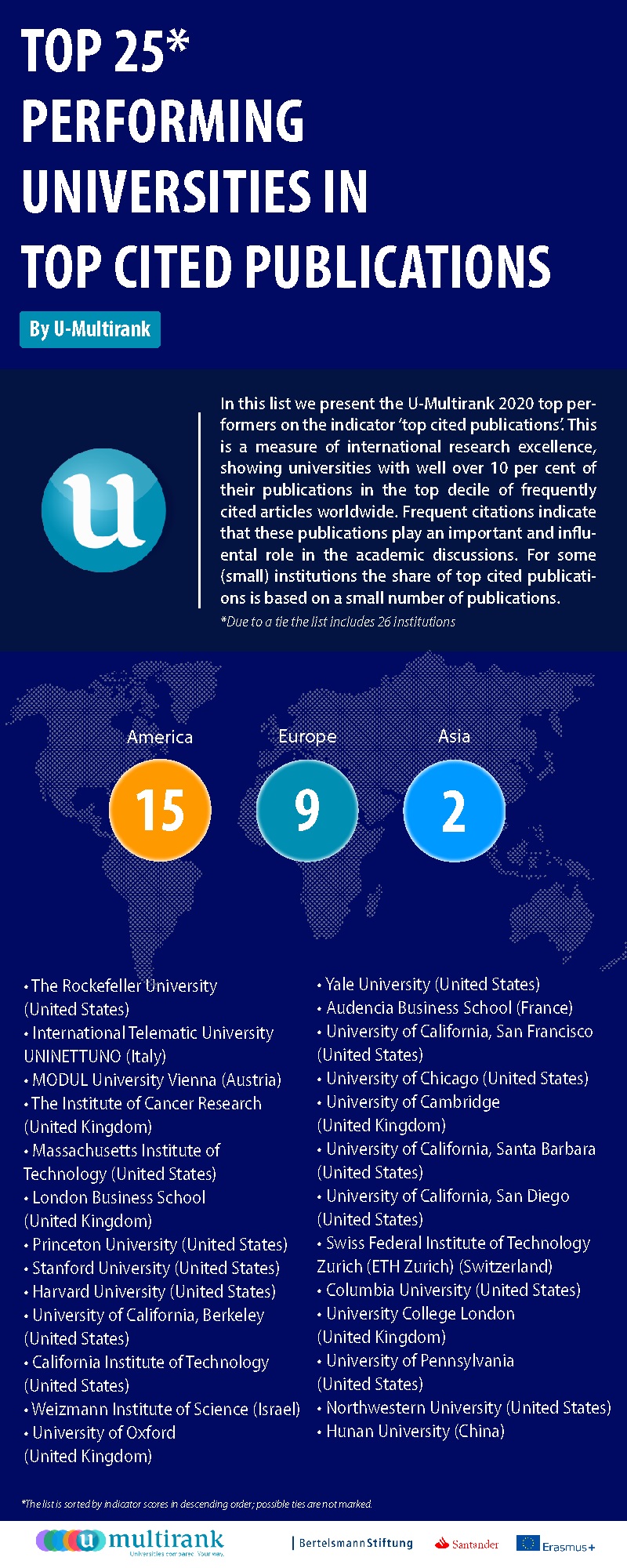Das von der Europäischen Kommission initiierte Universitätsranking U-Multirank stellt der privaten Wirtschaftsuniversität Modul University Vienna zum wiederholten Mal ein sensationelles Zeugnis für die Qualität ihrer Forschung aus. Die Privatuniversität, die bereits 2018 zum ersten Mal in der Kategorie "Am häufigsten zitierte Veröffentlichungen" mit Universitäten wie Harvard, Stanford und Yale mithalten konnte, schafft es auch 2020 wieder in die Liste der Top 25 Universitäten der Welt.