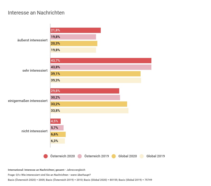 Zentrale Ergebnisse für Österreich, die noch vor dem Corona-Lockdown erhoben wurden: konstant hohes Interesse an Nachrichten, zunehmende Nutzung digitaler Quellen, leicht steigende Zahlungsbereitschaft für Online-Nachrichten (speziell jüngere Befragte), sowie ein leichter Anstieg beim Vertrauen in Nachrichten gegenüber den Vorjahren.