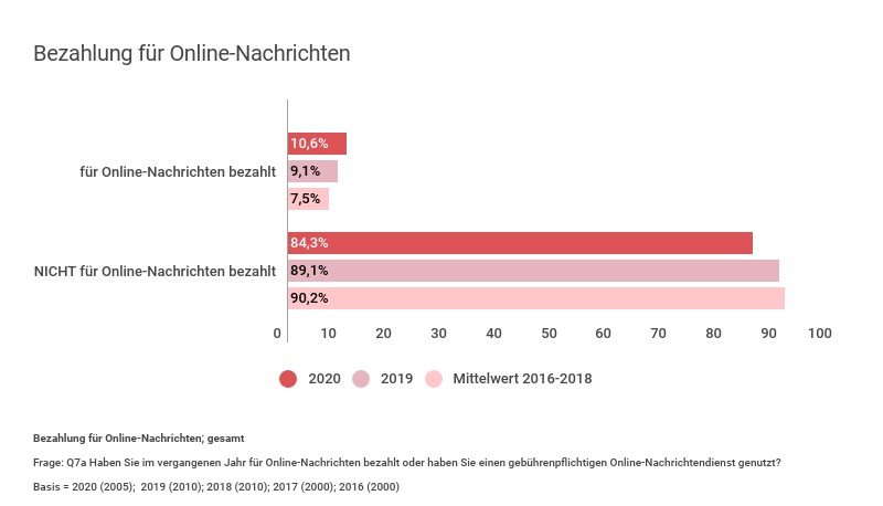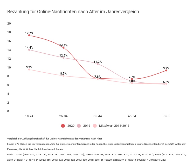 Im Jahr 2020 übersteigt die Zahlungsbereitschaft für Online-Nachrichten erstmals die 10-Prozent-Marke. Bei jüngeren Altersgruppen (von 18-34 Jahren) ist diese Bereitschaft sogar höher. Im Vergleich zu den Vorjahren gibt es bei diesen Altersgruppen einen langsamen, aber stetigen Anstieg.
