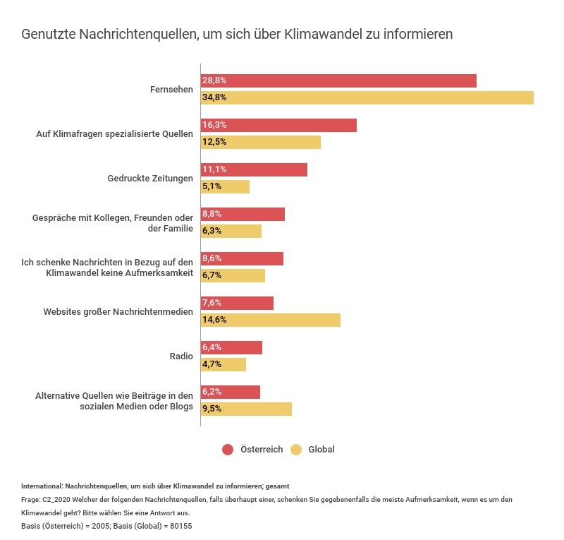 Erstmals beurteilten die Befragten auch den thematischen Zusammenhang zwischen dem Klimawandel und der Nachrichtennutzung. Im Vergleich mit dem globalen Mittelwert wird der Klimawandel in Österreich noch nicht als allzu schwerwiegendes Problem gesehen. Informationen über den Klimawandel werden bevorzugt über traditionelle Nachrichtenquellen wie Fernsehen und gedruckte Zeitungen bezogen.