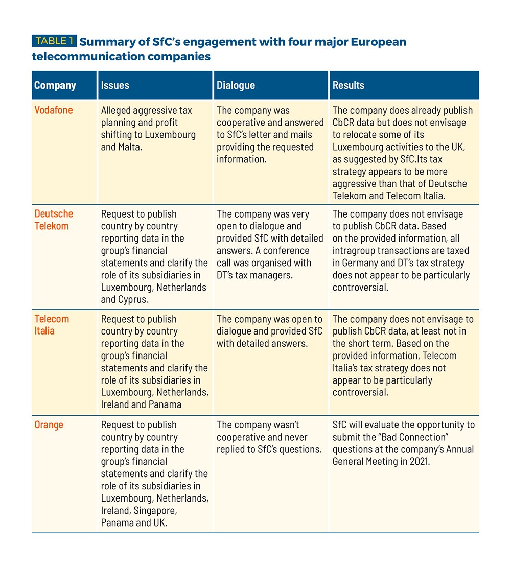 Das 18 Monate dauernde Engagement konzentrierte sich auf steuerrelevante Fragen, nachdem der SfC-Research "Bad Connection" veröffentlicht wurde, der ganz generell fehlende Steuertransparenz bei vier großen Telekommunikationsunternehmen in Europa bemängelte: Vodafone, Deutsche Telekom, Telecom Italia und Orange.