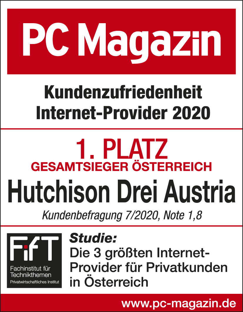 Drei erzielte bei der Zufriedenheitsstudie Breitband 2020 mit 115 Punkten und der Note 1,8 den ersten Platz in Österreich.