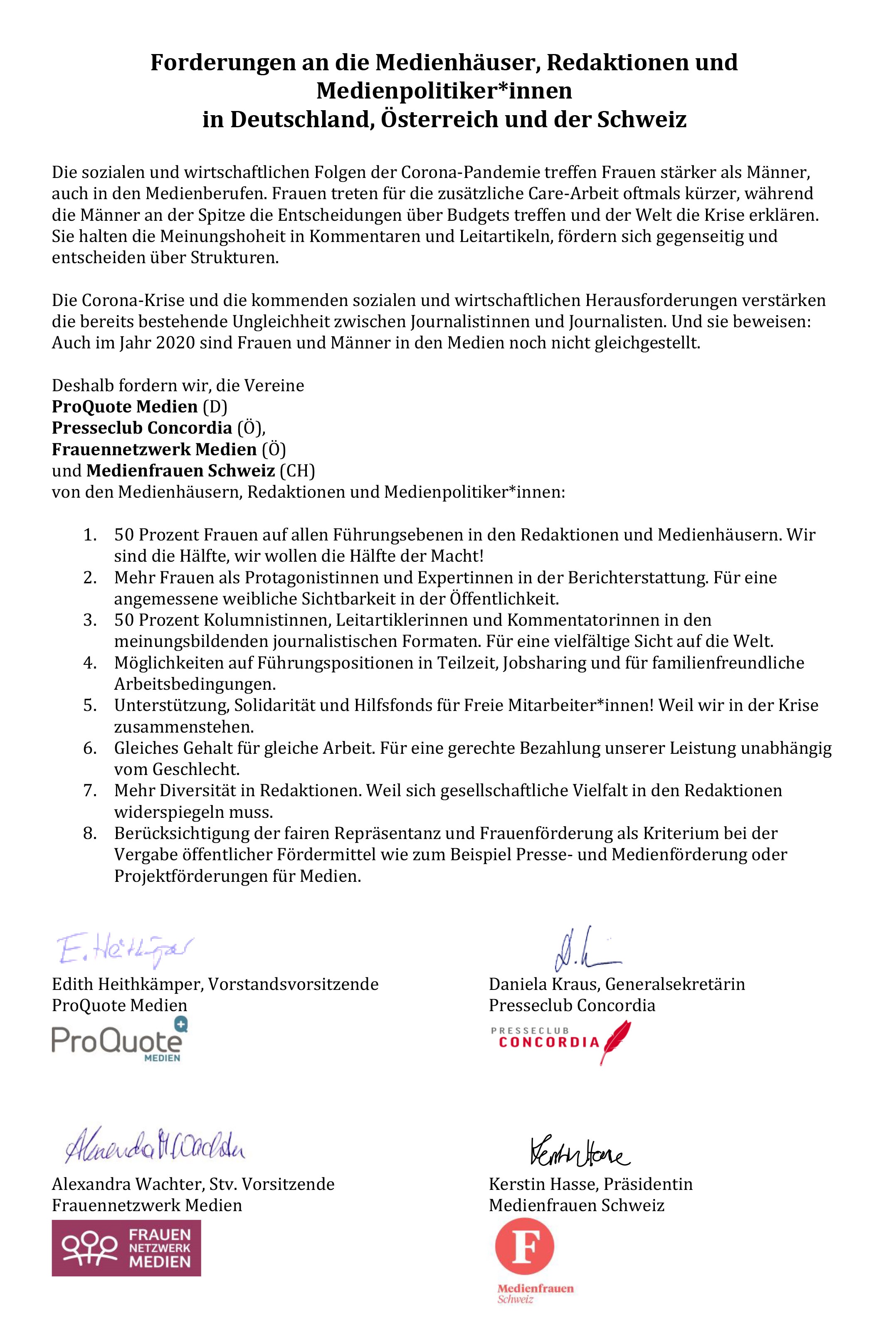 1. 50 Prozent Frauen auf allen Führungsebenen in den Redaktionen und Medienhäusern. Wir sind die Hälfte, wir wollen die Hälfte der Macht!