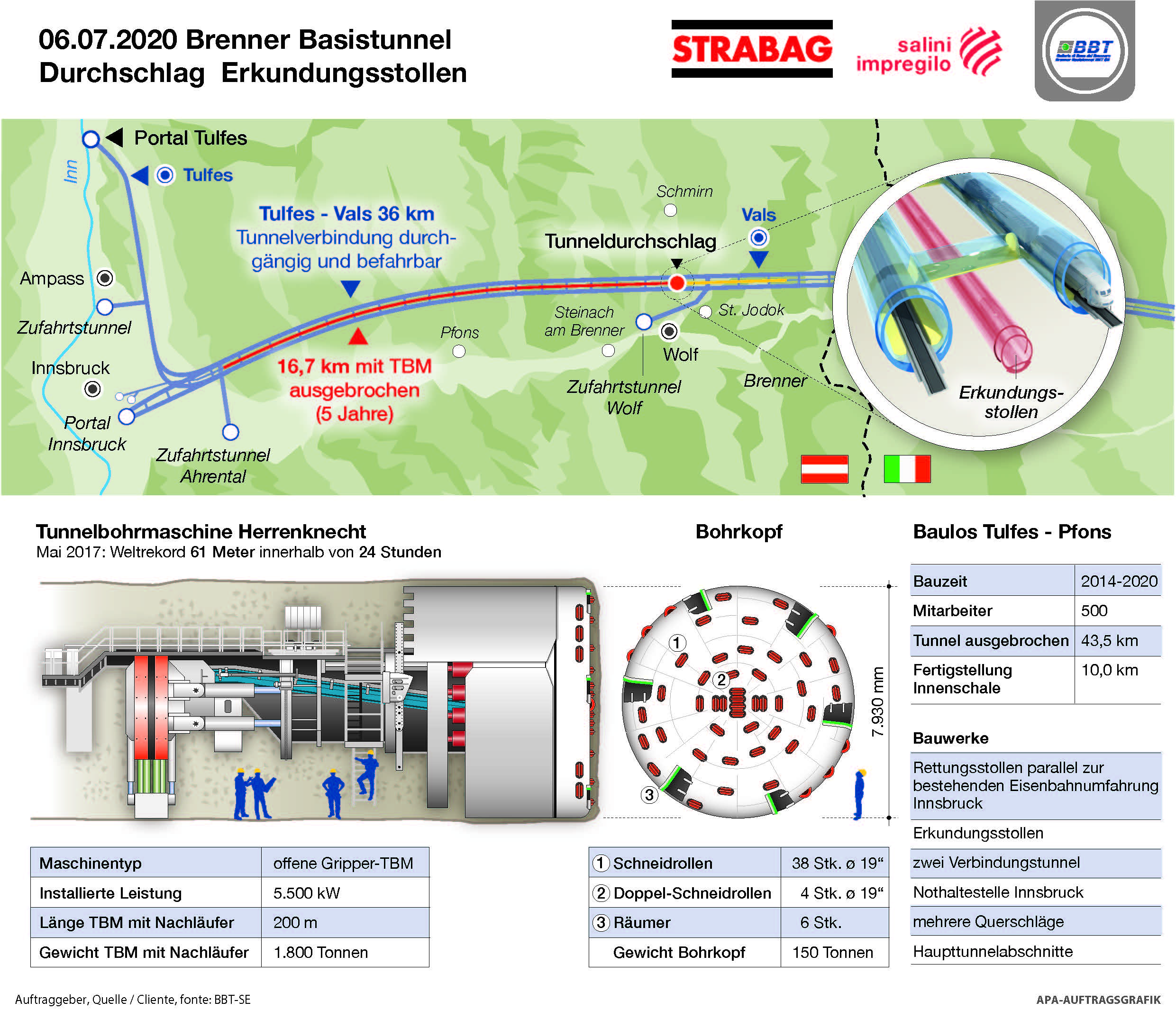 Bereits im Mai 2017 hat die Tunnelbohrmaschine für Schlagzeilen gesorgt. Weltweit erstmalig konnten mit ihr über 61 Meter innerhalb von 24 Stunden im Quarzphyllit-Gestein ausgebrochen werden. Die mittlere Vortriebsleistung betrug 11 Meter pro Tag.