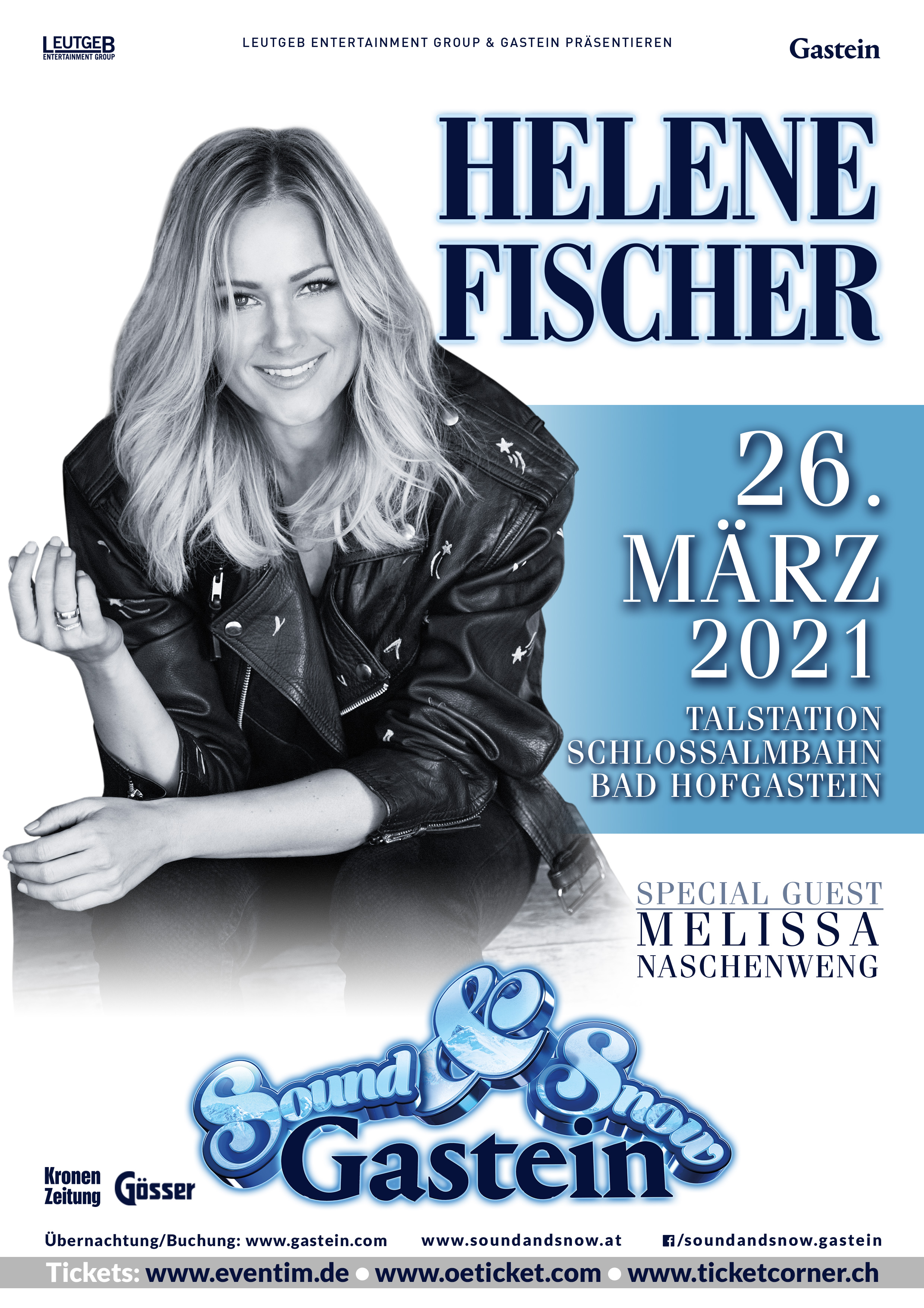 Das ursprünglich für den 4. April 2020 geplante Konzert mit Helene Fischer im Rahmen des Sound & Snow Festivals musste auf Grund der COVID-19 Pandemie verschoben werden. Nun endlich nach Monaten intensivster Bemühungen freut es uns als Veranstalter bekanntgeben zu können, dass mit FREITAG, den 26. März 2021 ein ERSATZTERMIN für das Konzert der erfolgreichsten deutschen Sängerin im Rahmen des SOUND & SNOW GASTEIN gefunden werden konnte. Auch die Künstlerin selbst blickt mit großer Erwartung auf 2021 und freut sich darauf, ihre Fans bei einem grandiosen Konzert zum Saisonfinale in Bad Hofgastein begeistern zu können.