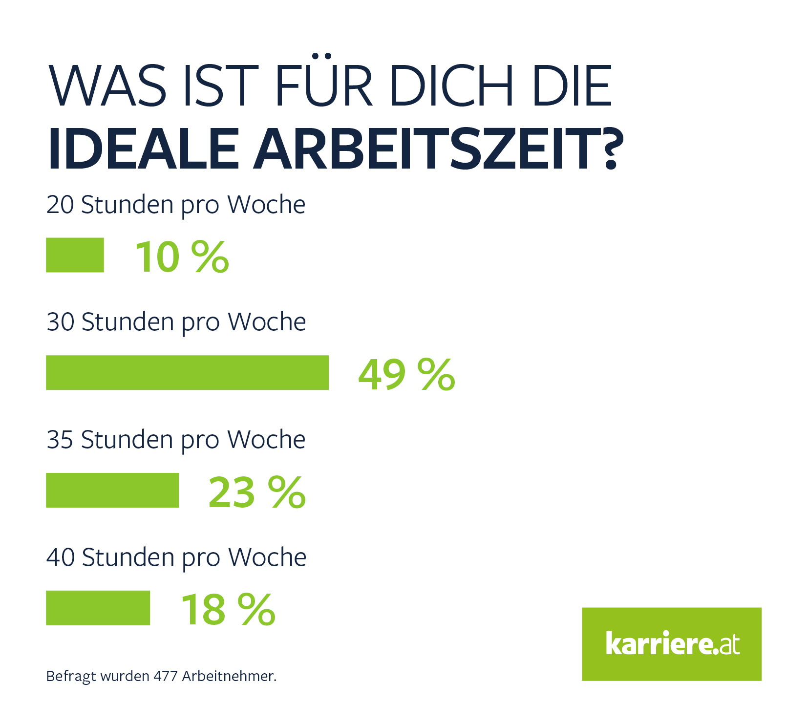 Mittels Online-Umfrage wollten wir von den karriere.at Usern wissen: Was ist für dich die ideale Arbeitszeit? Klarer Sieger ist die 30-Stunden-Woche. Von den 477 befragten Arbeitnehmern meint die Hälfte (49 Prozent): 30 Wochenstunden wären perfekt. Eine Halbierung der Normalarbeitszeit auf 20 Stunden kann sich nur jeder Zehnte vorstellen. Im Mittelfeld liegt die 35-Wochen-Stunde, die von immerhin 23 Prozent der Befragten als Ideal angesehen wird. Knapp jeder Fünfte (18 Prozent) würde an der momentanen Normalarbeitszeit von 40 Stunden pro Woche nicht rütteln.