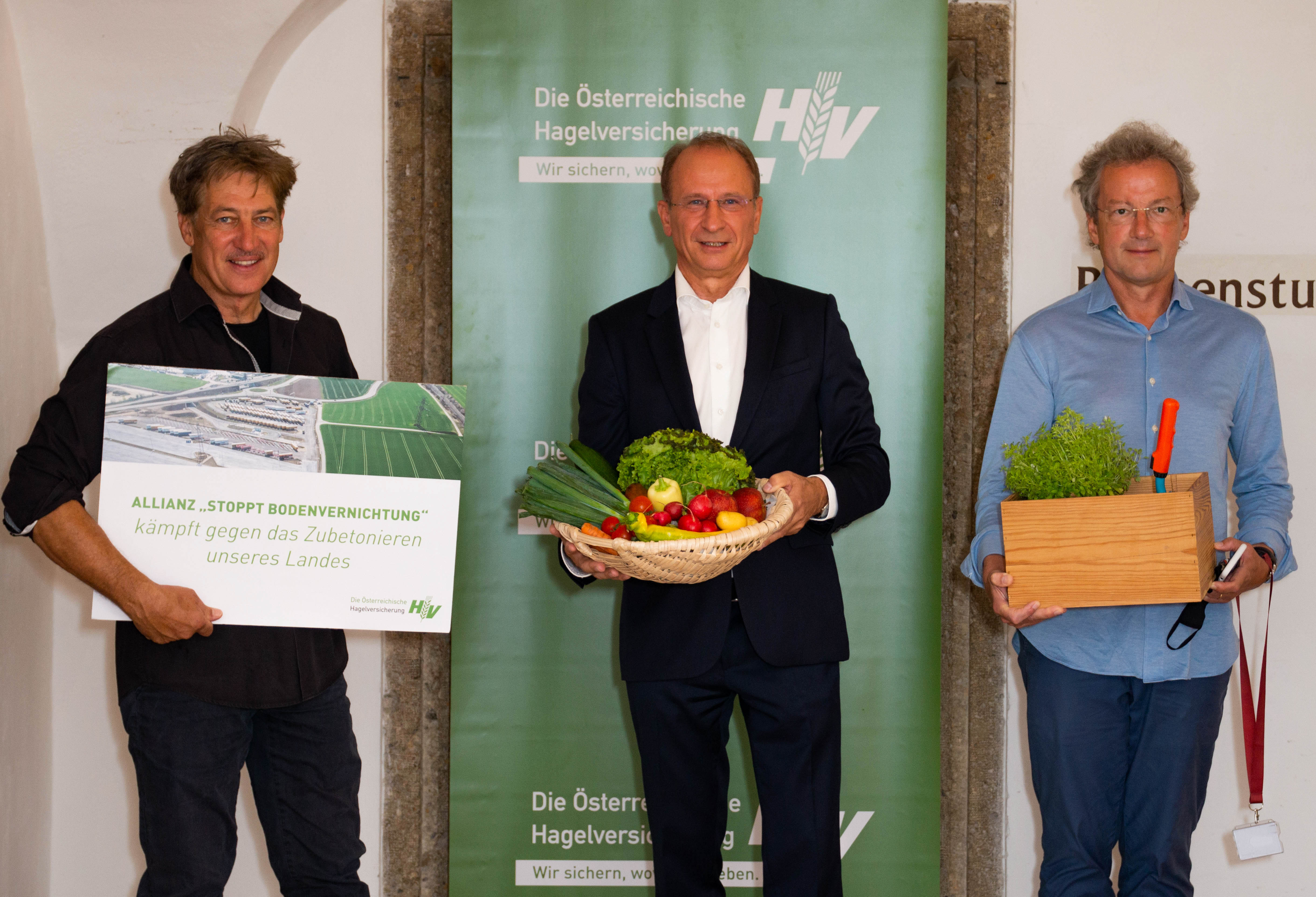 (Österreichische Hagelversicherung, 12. August 2020): Schauspieler Tobias Moretti und Stardirigent Franz Welser-Möst bilden mit Kurt Weinberger, dem Vorstandsvorsitzenden der Österreichischen Hagelversicherung, eine Allianz gegen den rasanten Bodenverbrauch. Alleine in den letzten 20 Jahren sind 150.000 Hektar Agrarflächen durch Verbauung zerstört worden, was der gesamten Ackerfläche des Burgenlands entspricht. Der tägliche Bodenverbrauch in Österreich liegt mit rund 13 Hektar (entspricht 20 Fußballfeldern) weit über dem im Regierungsprogramm verankerten Ziel von maximal 2,5 Hektar (entspricht rund 4 Fußballfeldern). Damit ist der Bodenverbrauch eines der brennendsten Umweltprobleme unserer Zeit.