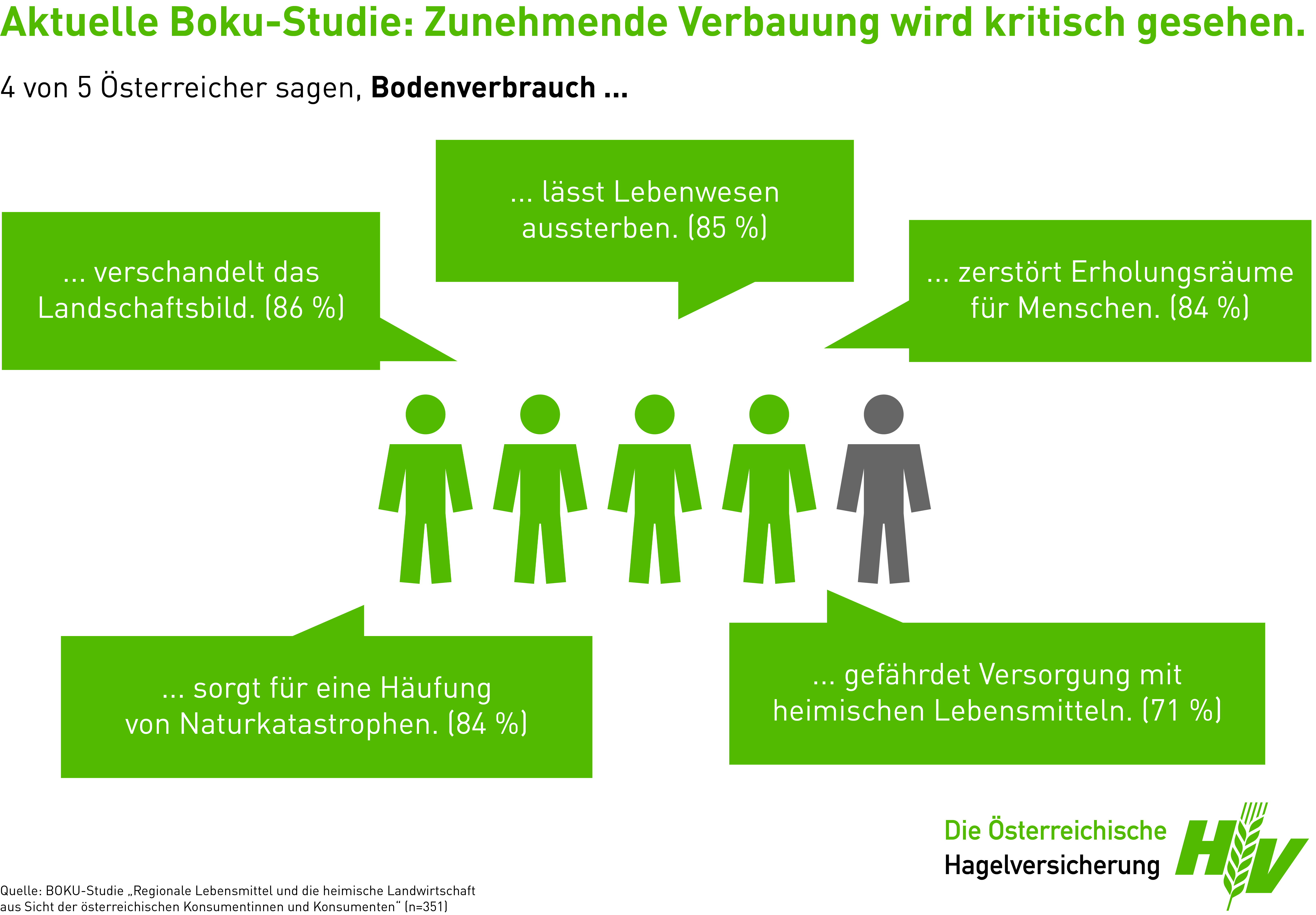 Tobias Moretti, langjähriger Unterstützer der Bodenverbrauchskampagne der Österreichischen Hagelversicherung, sieht vor allem die Versorgung Österreichs mit regionalen Lebensmitteln gefährdet: „Wir legen unsere Lebensmittelversorgung in Schutt und Asche und sägen damit am eigenen Ast. Besonders in Krisenzeiten legen die Österreicherinnen und Österreicher zunehmend mehr Augenmerk auf den Konsum regionaler Lebensmittel. Wir jedoch machen uns durch den hohen Flächenverbrauch in Österreich immer mehr von ausländischen Lieferanten abhängig. Ganz abgesehen vom Wahnsinn, ständig unsere Grün- und Ackerflächen in Bau- und Industrieland umzuwidmen. Es gibt ja kein Zurück mehr! Braucht wirklich jedes Dorf sein eigenes Industrie- bzw. Shoppingcenter? In und um Innsbruck gibt es mittlerweile vier bis fünf große Einkaufszentren, in einem Gebiet, das vielleicht 15 km umfasst. Man braucht nie mehr von Kultur zu reden, wenn man die Kultur des eigenen Lebens und Lebensraumes vernichtet.“