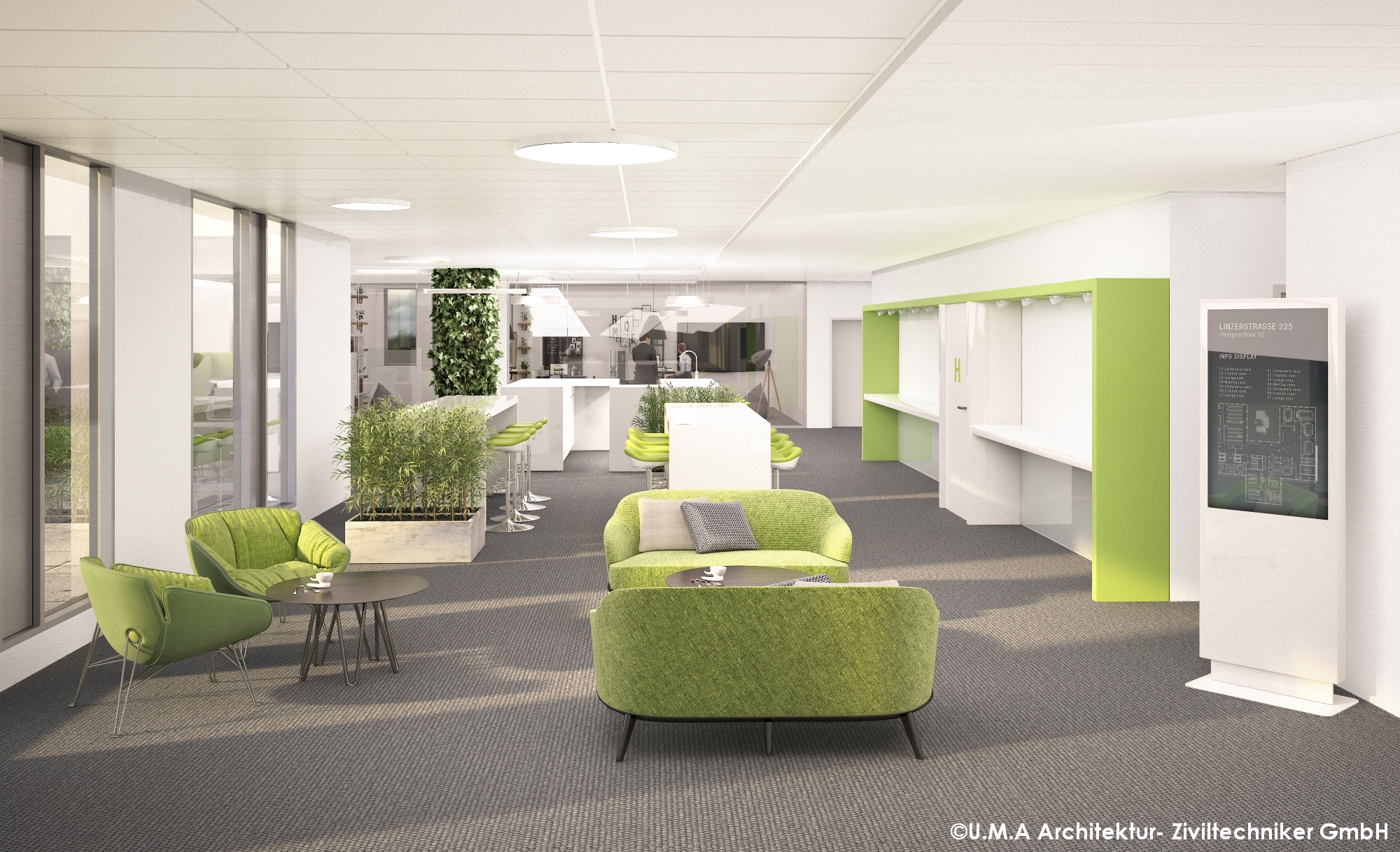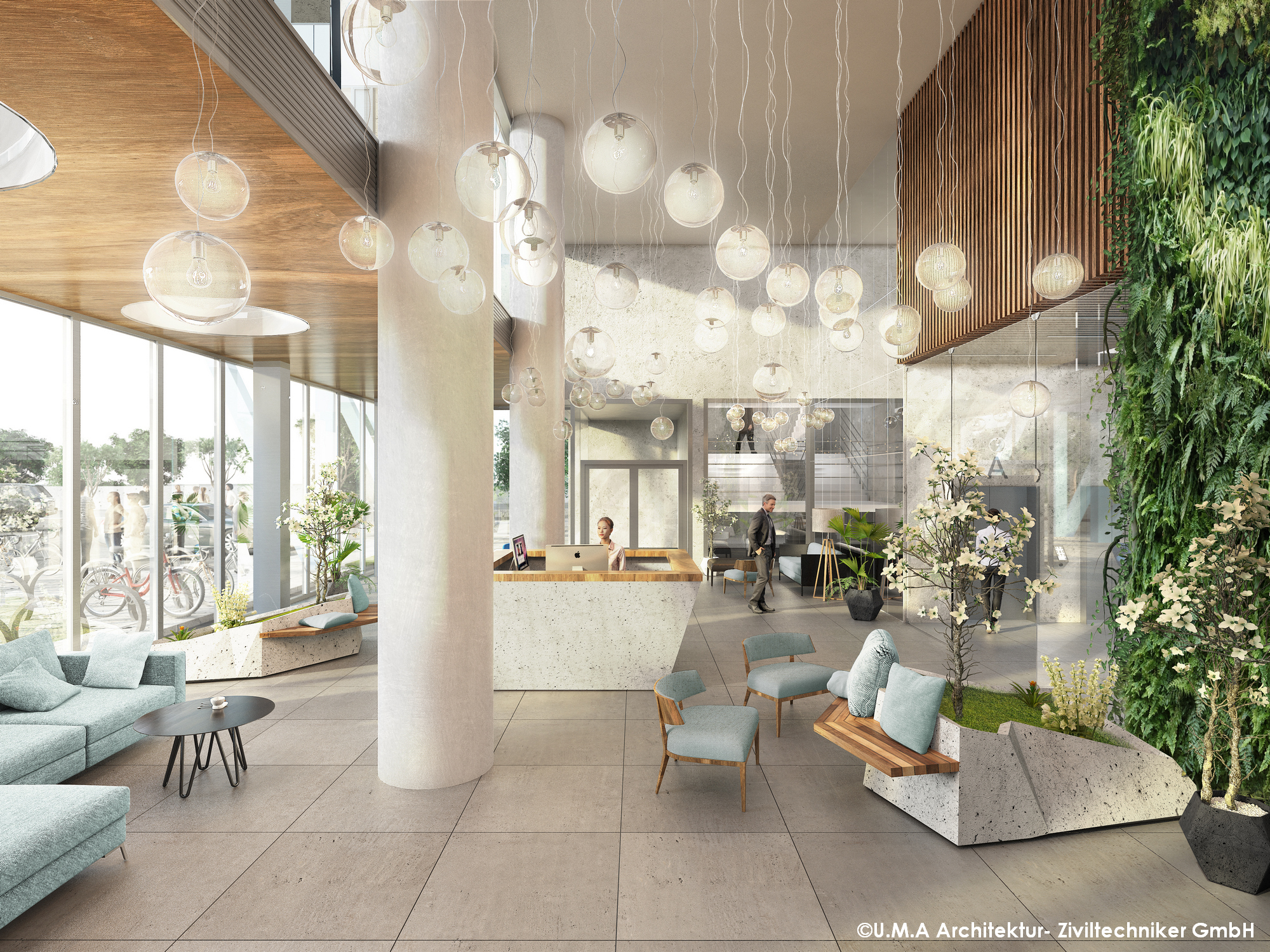 Schon im Außenbereich des Erdgeschoßes zeichnet sich das „grüne“ Flair des gesamten Hauses ab. Zahlreiche Bäume sorgen für Schatten und eine angenehme Atmosphäre. Darüber hinaus gibt es im Dachgeschoß eine 250 m² große Photovoltaikanlage.