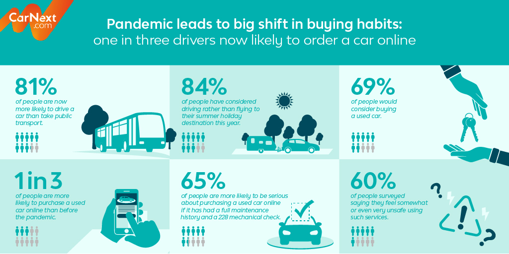 Die Umfrage ergab, dass 81 % der Personen in den befragten Ländern aufgrund der Pandemie nun eher das Auto, anstelle von öffentlichen Verkehrsmitteln, nutzen. Und jeder dritte Autofahrer zieht jetzt in Betracht, ein Fahrzeug online zu kaufen.