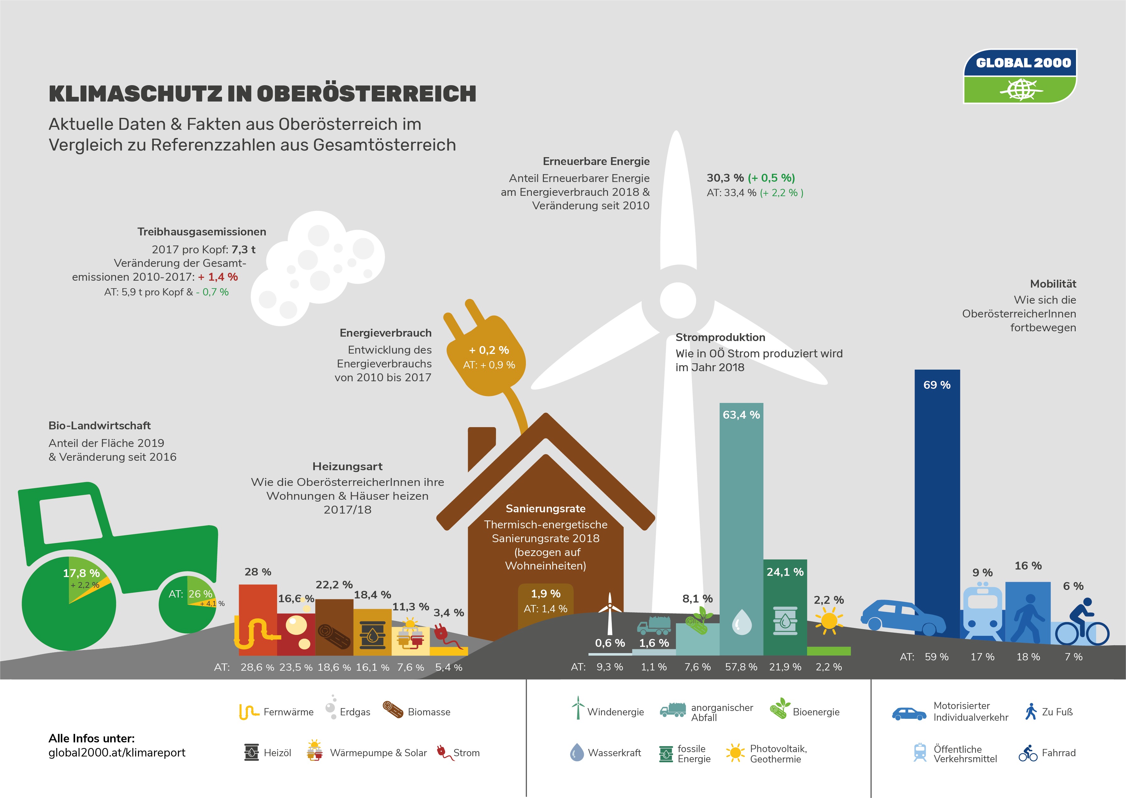 In einem großen Klimaschutzbericht, welcher im Rahmen der Umweltinitiative Mutter Erde veröffentlicht wird, untersucht die österreichische Umweltschutzorganisation GLOBAL 2000 die Fortschritte der Bundesländer beim Klimaschutz seit 2010. Das Bild zeigt für Oberösterreich noch großen Handlungsbedarf: „Von allen Bundesländern hat Oberösterreich die höchsten Pro-Kopf-CO2-Emissionen, das sollte Anlass geben, die bisherigen Strategien und Maßnahmen zu überdenken. Vor allem die hohe Verkehrsbelastung und der niedrige Anteil erneuerbarer Energien sind ein großes Problem. Vergleichsweise gut schneidet Oberösterreich hingegen bei der Sanierungstätigkeit ab", betont Johannes Wahlmüller, Klima- und Energiesprecher von GLOBAL 2000.