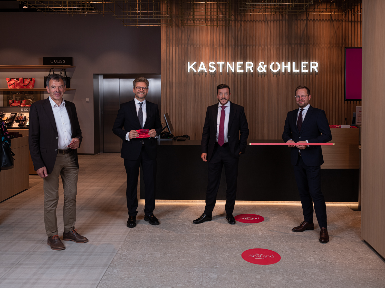 Am Bild: Die beiden Kastner & Öhler-Vorstände Martin Wäg und Alexander Petrskovsky hießen die ersten Gäste beim Preopening am Mittwochabend herzlich willkommen – darunter Georg Willi (Bürgermeister von Innsbruck) und René Benko (SIGNA Gründer & Beiratsvorsitzender). Hostessen und Hosts sorgten unterdies mit eigenen K&Ö-Messstäben für den notwendigen Mindestabstand.