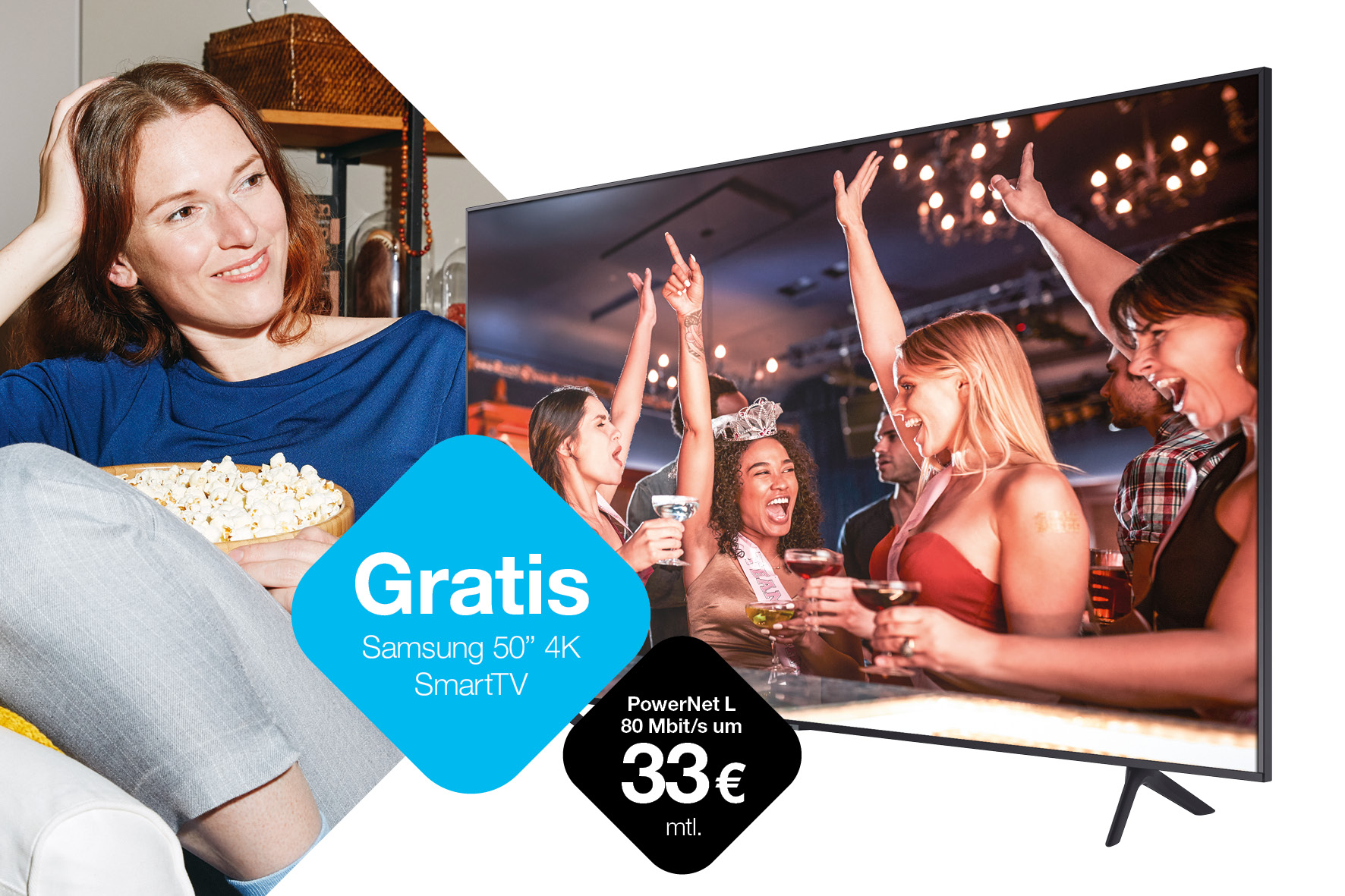 - Gratis 50 Zoll Samsung Smart-TV bei Neuanmeldung zum Tarif PowerNet L mit Mindestvertragsdauer.