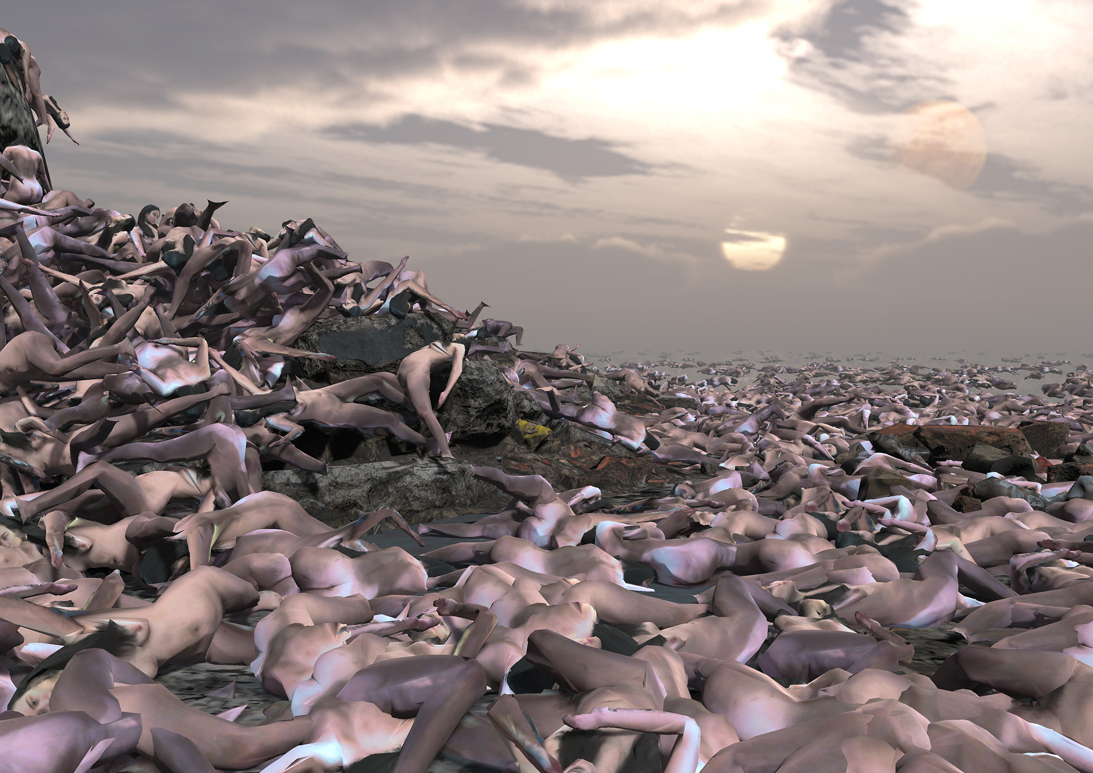 Mit ihrer Pop-up-Ausstellung "when you are close to me I shiver" („Wenn du in meiner Nähe bist, zittere ich“) gibt Martina Menegon Klimasorgen und Zukunftsängsten Raum und verwandelt die MAK GALERIE in eine dystopische, verstörende „Climate Fiction“. Die titelgebende, algorithmisch gesteuerte Live-Simulation, eine in Echtzeit generierte virtuelle Realität, skizziert eine bedrückende Version der Zukunft: Aus Verzweiflung versammeln sich Menschen in Massen auf dem letzten verbliebenen Stück Erde. Jeder Quadratzentimeter ist dicht gedrängt. Einige versuchen, sich auf Klippen zu retten, wo Hunderte Menschen aus Höhen fallen, die sie niemals hätten erklimmen dürfen. In apokalyptischer Bildsprache zeichnet die Künstlerin in der vierten Position der Reihe CREATIVE CLIMATE CARE, einer Kooperation des MAK und der Universität für angewandte Kunst Wien, ein pessimistisches, fiktionales Szenario zu den ökologischen und soziokulturellen Auswirkungen der virulenten Klimakrise.