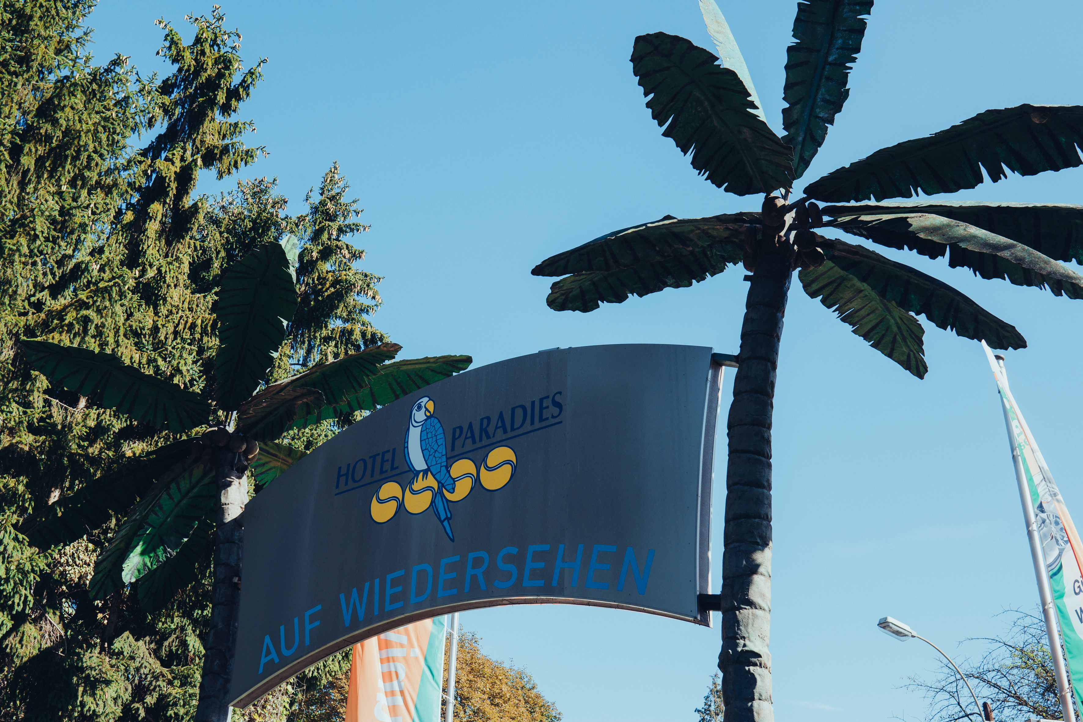 Hinzukommen zahlreiche Einzelstücke und Deko-Objekte, Leuchten, Grünpflanzen und Vieles mehr. Auch 13 Säcke Tennissand sind zu haben. Und zu guter Letzt kommen sogar die Vordächer, das Balkongeländer und die kultigen Leuchtreklamen des Hotel Paradies unter den Hammer.