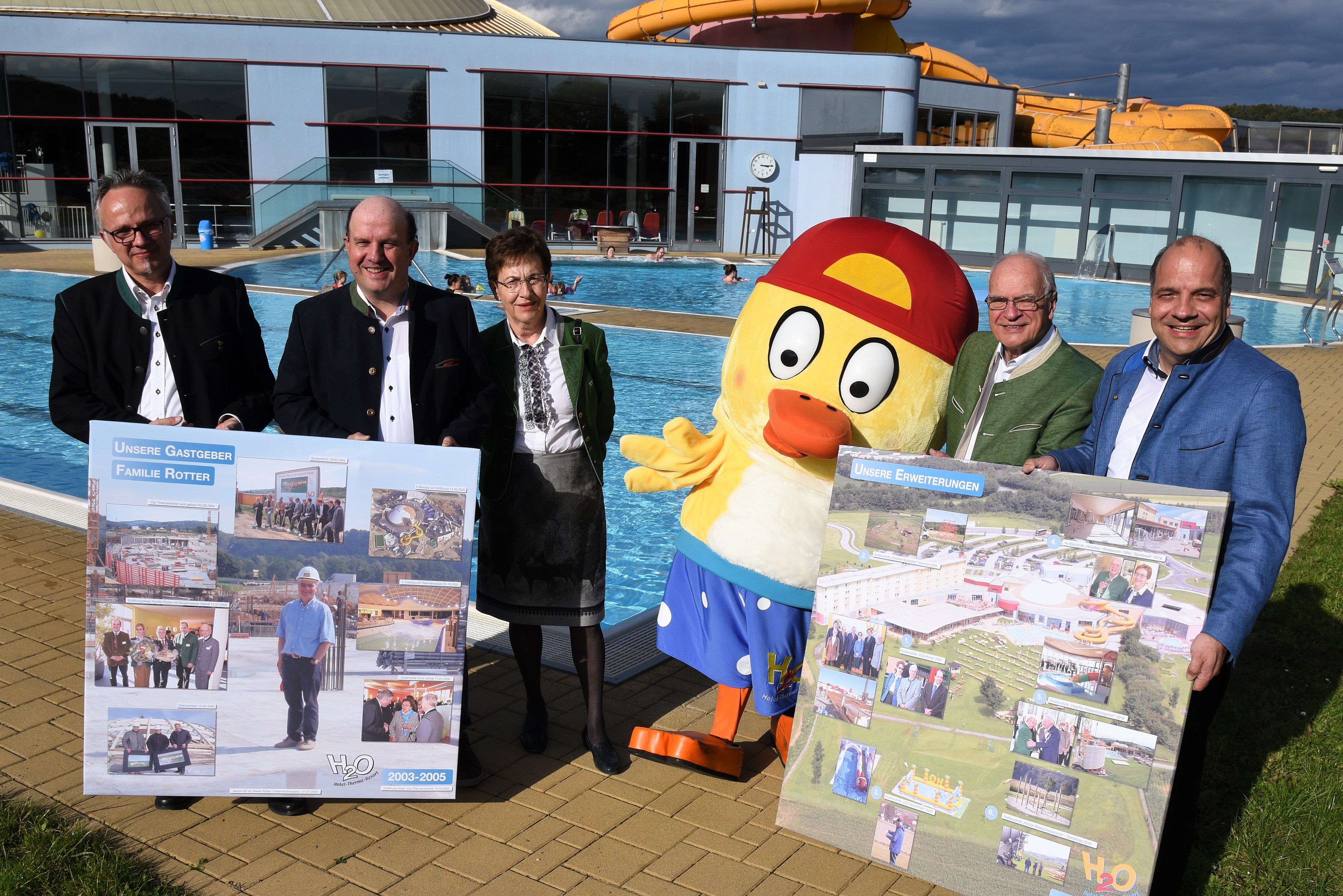 Am 14.Oktober vor 15 Jahren wurden die Türen des H2O-Hotel-Thermen-Resorts das erste Mal geöffnet. Aus diesem Grund hat Betreiberfamilie Rotter diese Woche im engsten Familienkreis das Jubiläum gefeiert. Zum feierlichen Anlass wurde Senior-Geschäftsführer Dr. Dieter Rotter von seinem Sohn Mag. Christian Rotter eine Foto-Collage über die erfolgreich umgesetzten Meilensteine der letzten Jahre überreicht. Vater Dieter Rotter, Mutter Trude Rotter, Bruder Stephan Rotter und Geschäftsführer Christian Rotter sind die Gründer und Personen hinter dem H2O-Hotel-Therme-Resort.