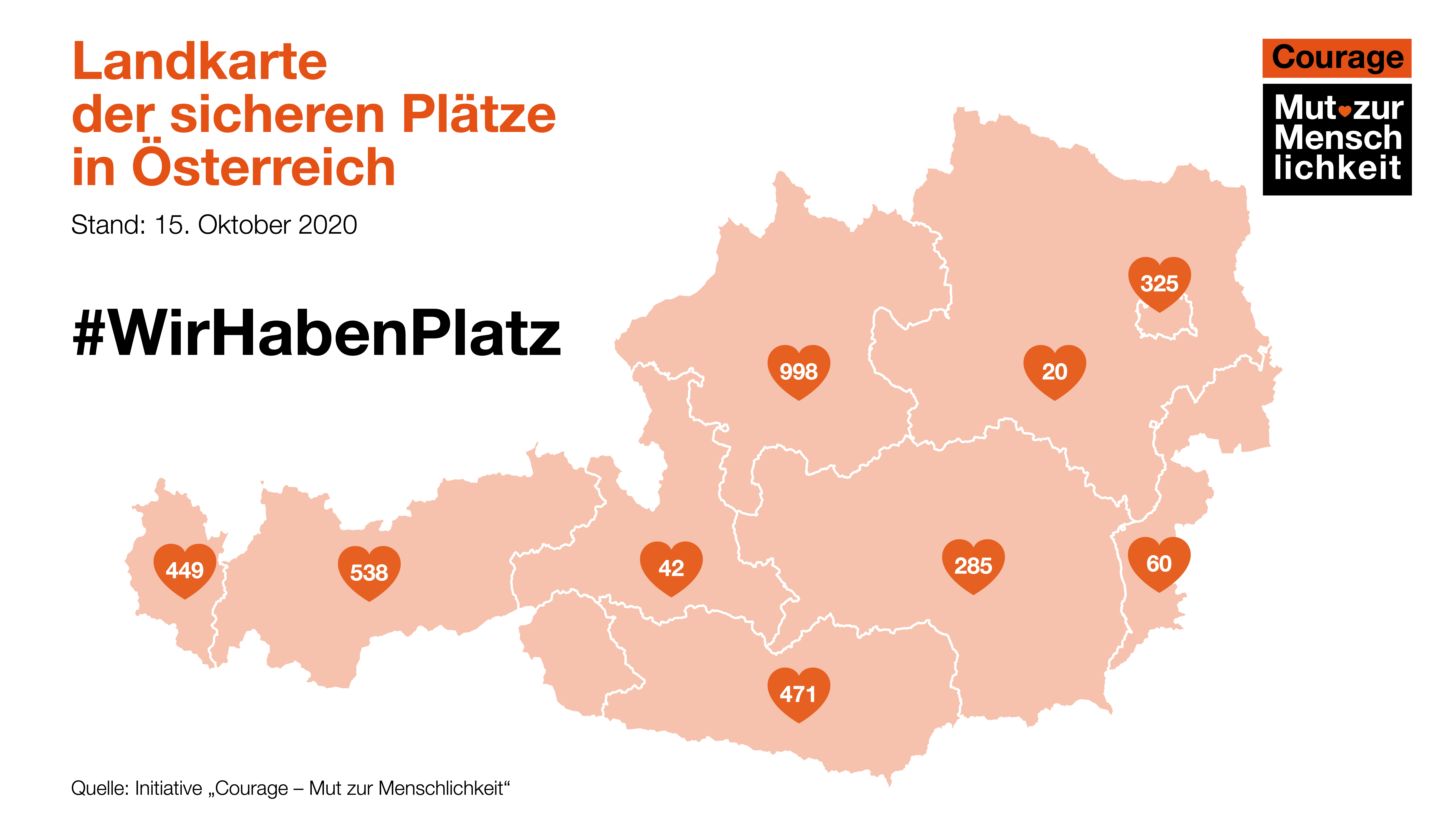 Unzählige Organisationen, Initiativen, Religionsgemeinschaften, Gemeinden, Städte und Privatpersonen aus dem ganzen Land haben auf einen Aufruf der Initiative „Courage – Mut zur Menschlichkeit“ reagiert und daran mitgewirkt, eine erste „Landkarte der sicheren Plätze“ in Österreich zu zeichnen. Diese Erhebung zeigt, dass es möglich wäre, in kürzester Zeit mindestens 3.188 sichere Plätze zu schaffen, um Menschen aus den griechischen Lagern zu retten.