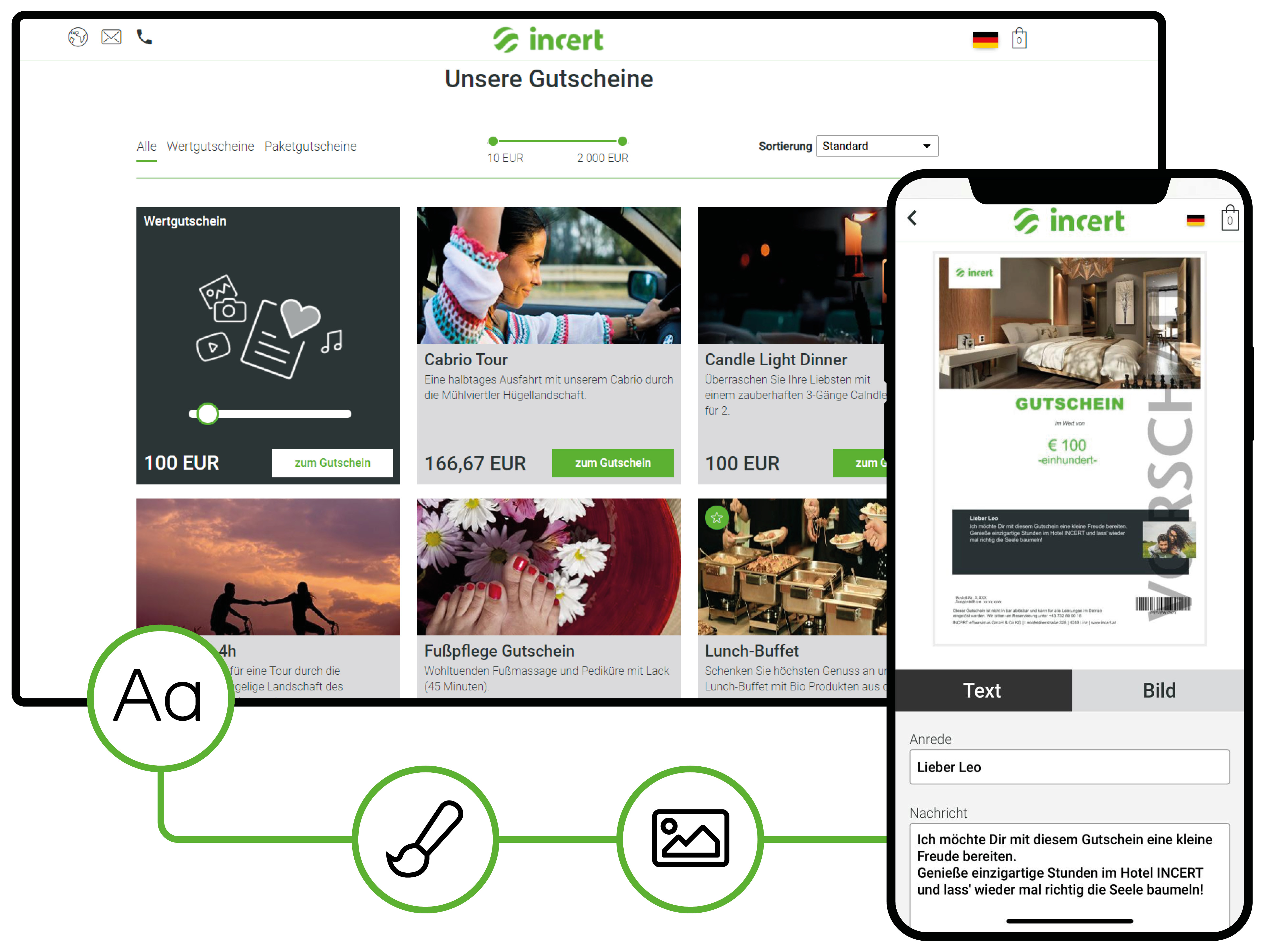 - Personalisierung der Gutscheine mit eigenem Foto & Text