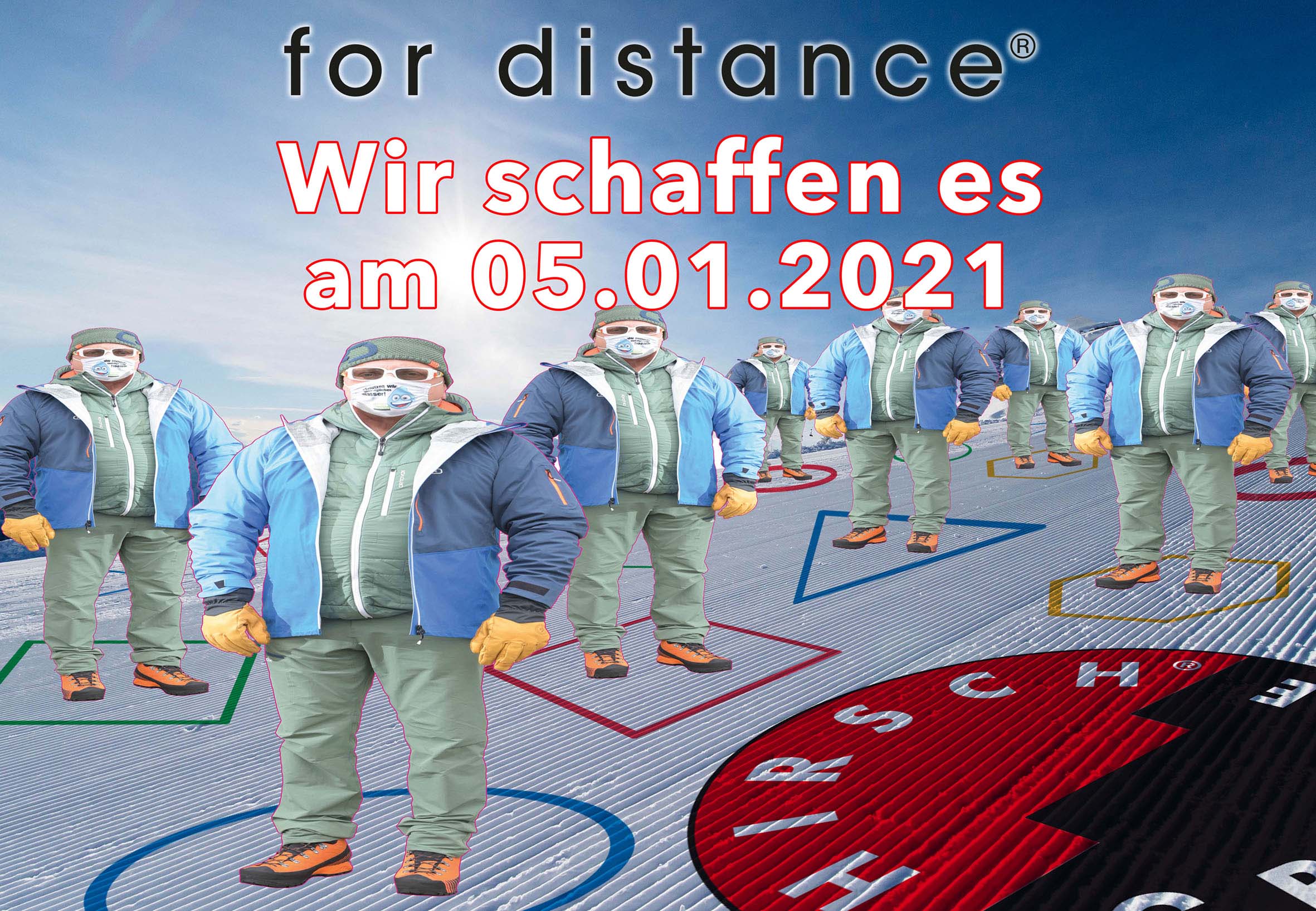 Mit Hilfe dieser Kunstaktion soll gleichzeitig für die Winterfreuden auf den Skipisten geworben werden. „Schisport darf nicht als Luxus angesehen werden, und wenn der notwendige Abstand eingehalten wird, dann gibt es keine Ansteckungsgefahr. ‚for distance‘ ist eine Covid-Maßnahme und auf diese Weise könnte der Wintersport genossen werden“, so Eberhart. Der Aktionist regt zudem an, dass jetzt in den Corona-Zeiten die Schulkurse mit dem Breitensport Schifahren neu durchdacht und in jedem Fall unter gesundheitlichen Aspekten durchgeführt werden müssten, „damit Seilbahnen, Gastronomie und Hotellerie doch wieder öffnen können“.