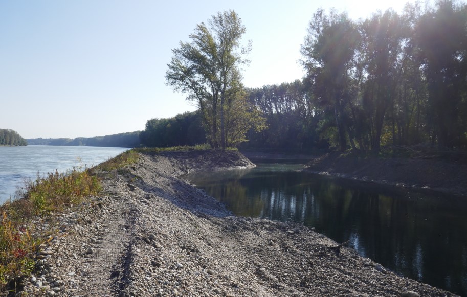 Im Zuge der zweiten Revitalisierungsphase ab September 2020 ging es schließlich – in einem Zeitraum von etwa vier Wochen – an die Wiederherstellung der ehemaligen Wasserfläche im Hinterland oberhalb der Fischamündung. Auf diese Weise entstand ein flacher und strömungsberuhigter Seitenarm mit unterstromiger Anbindung an den Fluss. Mit abwechslungsreicher Charakteristik und günstigen Flachwasserbereichen dienen die renaturierten Uferstrukturen und die neu entstandene Wasserfläche nun als idealer Fortpflanzungs- und Aufzuchtplatz für Fische, Amphibien, Makrozoobenthos und mehr. Insgesamt wurden im Zuge der Revitalisierungsmaßnahmen an der Fischamündung mehr als 30.000 Kubikmeter Kies bewegt. Das entspricht dem Ladevolumen von 2.000 bis 3.000 Kipplastern. Im Rahmen des Geschiebemanagements von viadonau wurde der entfernte Kies an geeigneter Stelle schließlich in den Strom verklappt – ein wichtiger Beitrag zur Bekämpfung der Sohleintiefung der Donau.