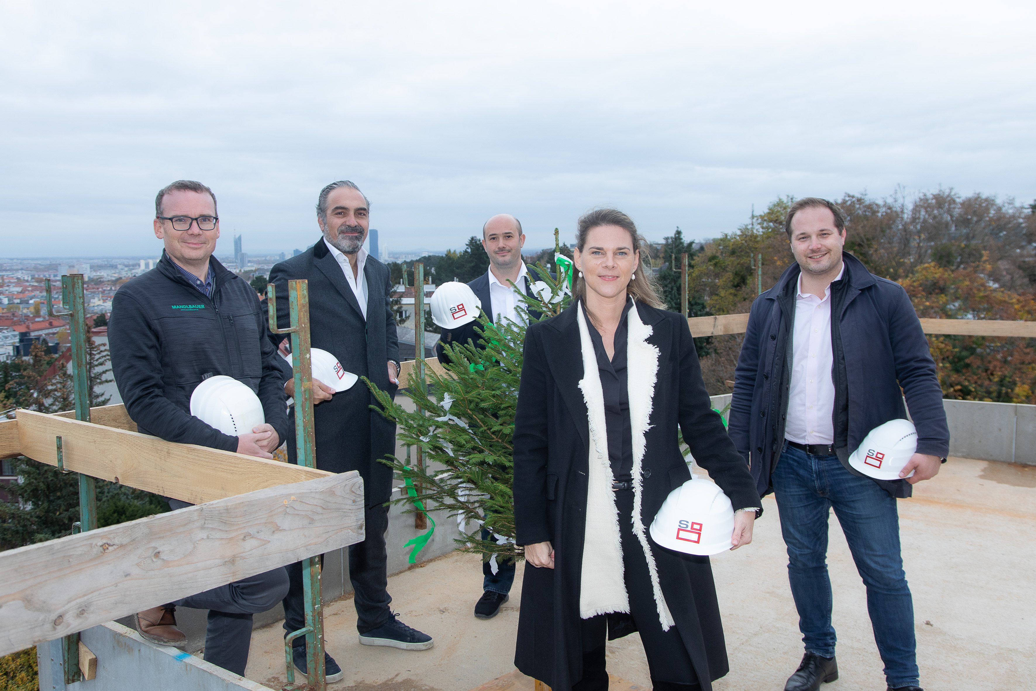 Die beiden Geschäftsführer der SEESTE Bau GmbH, Johanna Seeber und Nikolaus Hofstätter, durften anlässlich der Fertigstellung des Rohbaus Döblings Bezirksvorsteher Daniel Resch, sowie Architekt Zaid Al Khafaji von uma architektur ZT GmbH und Wolfgang Trink, Prokurist des ausführenden Bauunternehmens Mandlbauer Bau GmbH, begrüßen. Da die traditionelle Gleichenfeier coronabedingt nicht wie gewohnt stattfinden konnte, dankte die Geschäftsführung der SEESTE dem Prokuristen des Bauunternehmens Mandlbauer stellvertretend für alle Baubeteiligten und würdigte den exzellenten, unfallfreien Bauverlauf durch die Übergabe des Gleichengeldes.